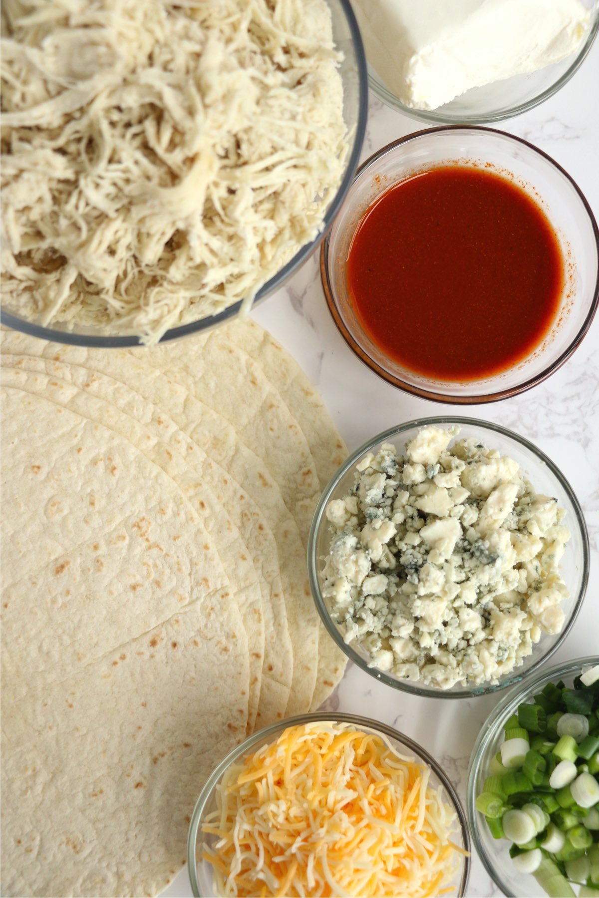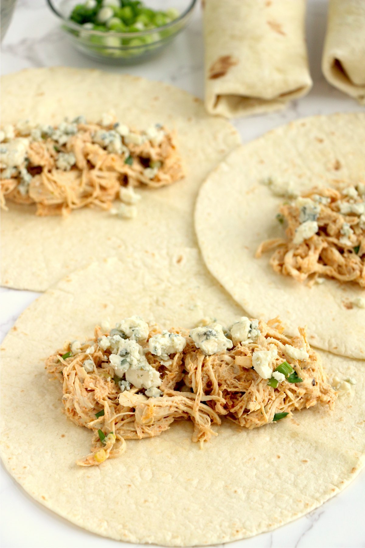 - Spoon buffalo chicken mixture in the center of your tortillas.