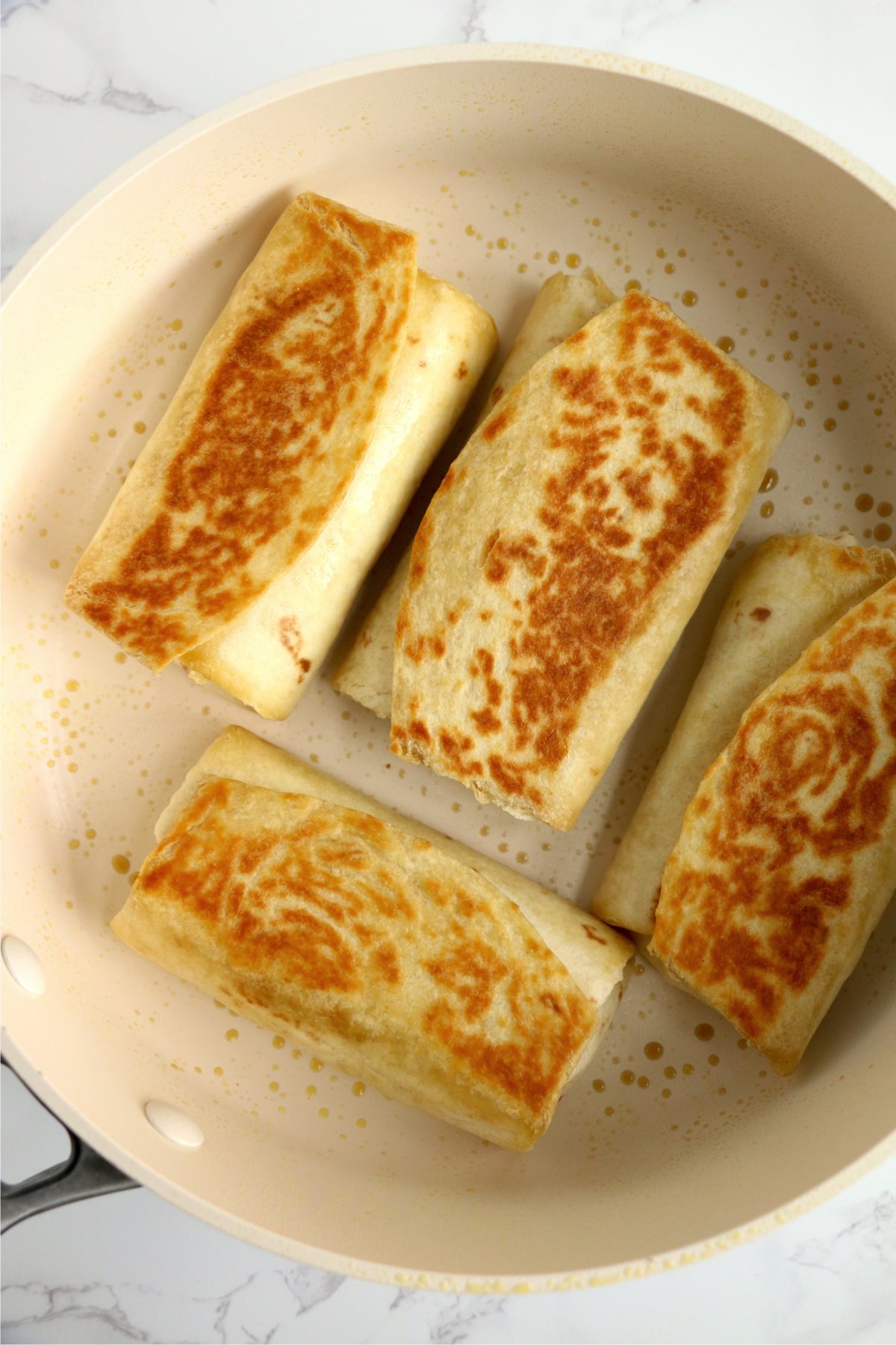 - Spray the tops of snack wraps and flip to cook the other side. Continue cooking until that side is golden brown.