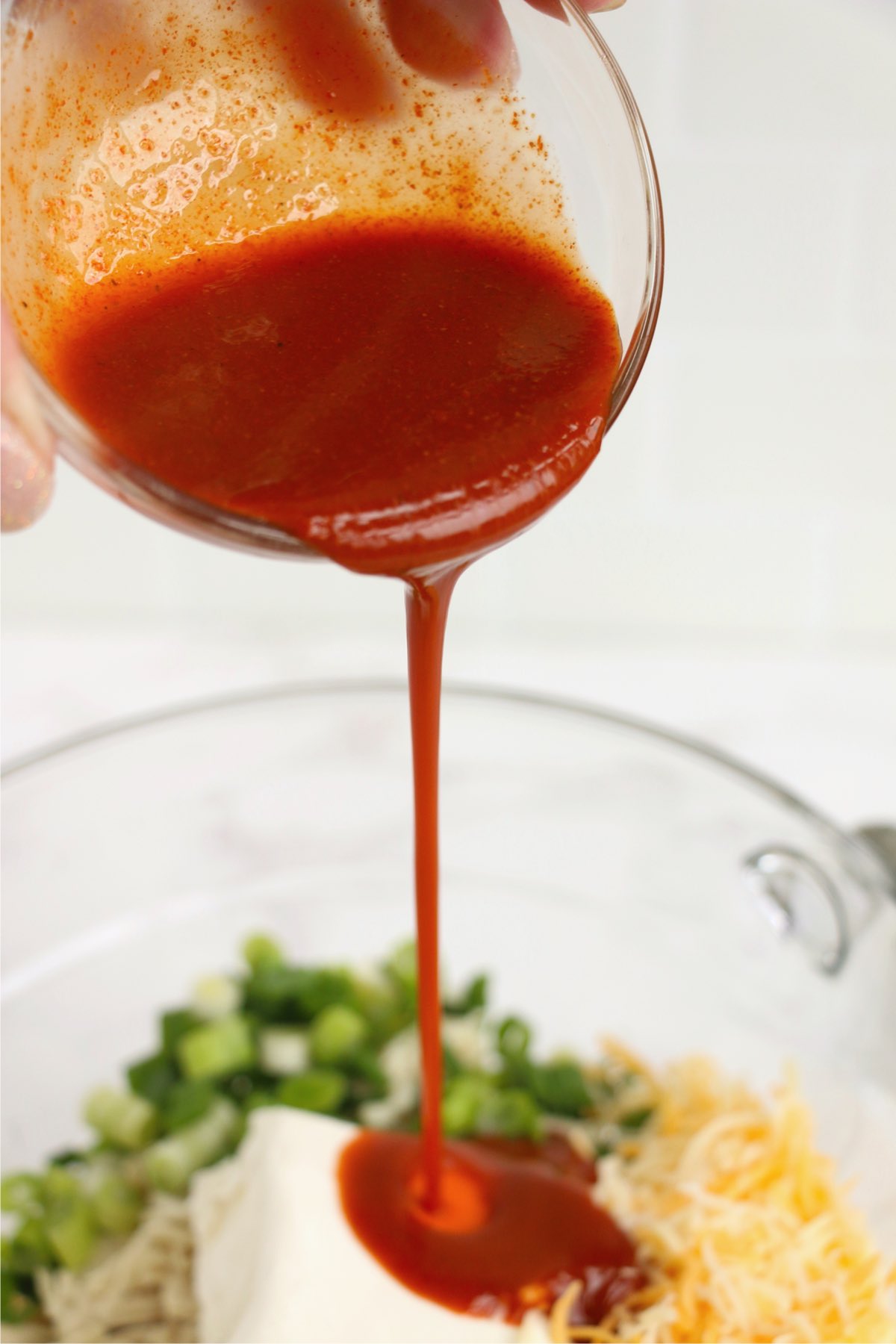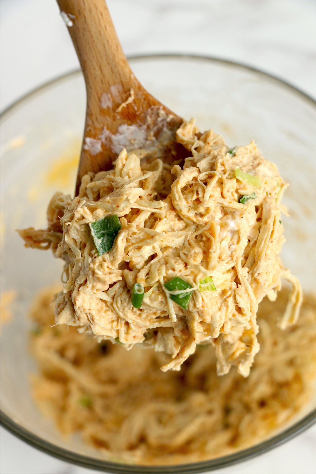 - In a large mixing bowl, combine chicken, cream cheese, buffalo sauce, shredded cheese, and green onions.