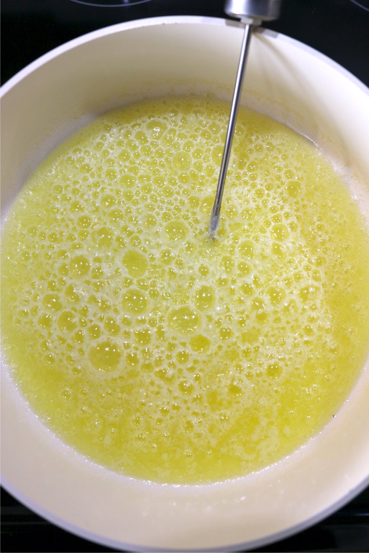 - Begin adding butter, one piece at a time. Whisk until butter is completely melted before adding the next piece. Your goal temperature is right around 175ºF. Use a kitchen thermometer to monitor your temperature and adjust heat settings accordingly.