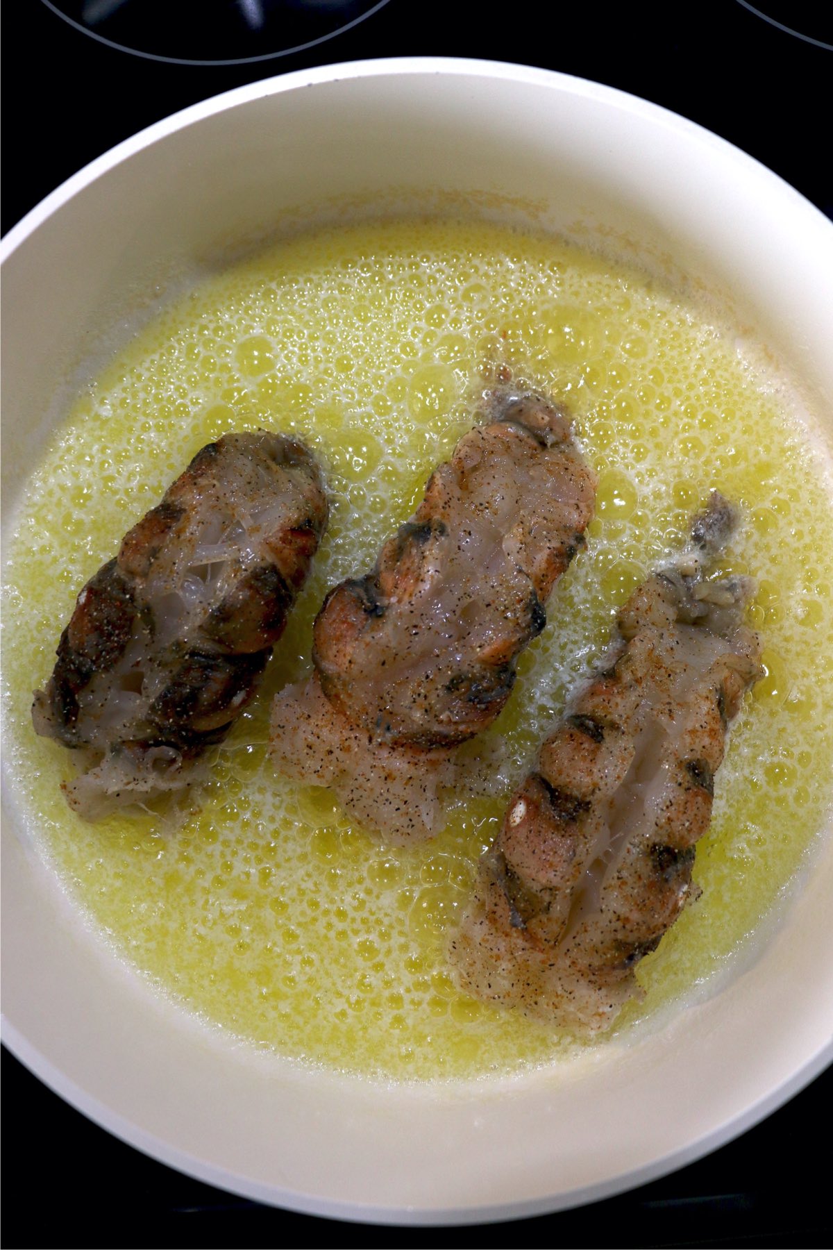 Step 9: Place prepared lobster tails in butter poaching liquid.