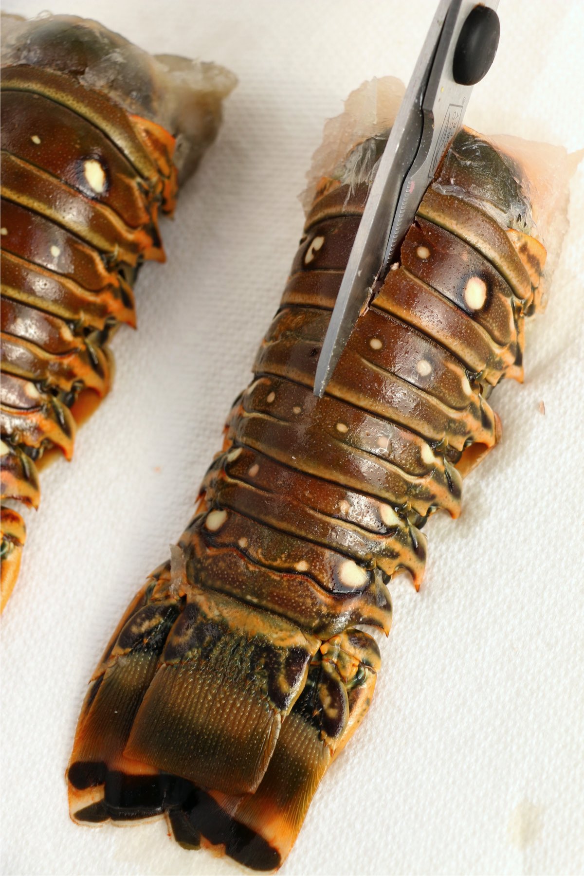 - Using a kitchen shears, cut down the middle of the top of each lobster tail.