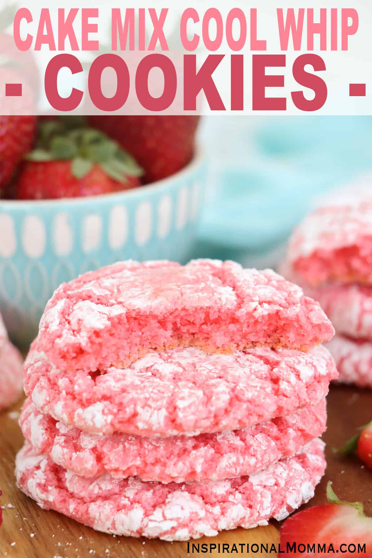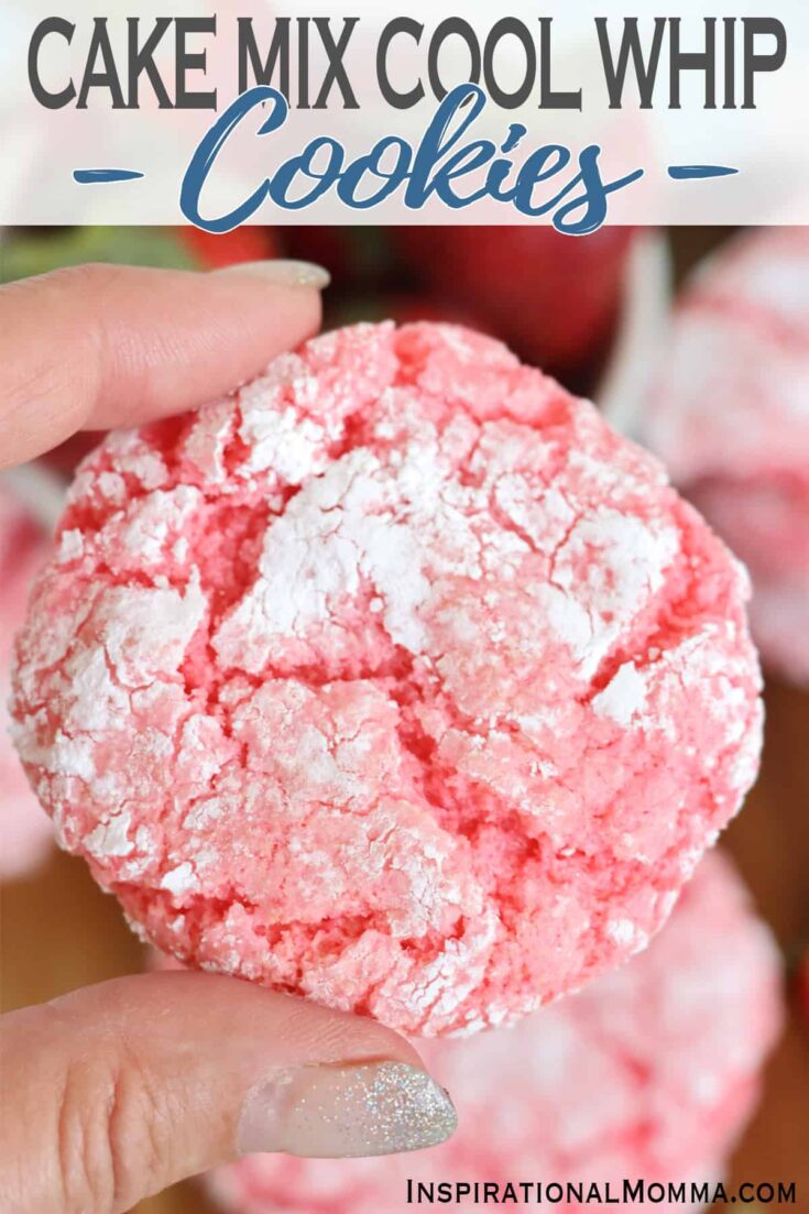These cake mix Cool Whip cookies are soft, chewy, and loaded with strawberry flavor, thanks to strawberry cake mix! #inspirationalmomma #cakemixcoolwhipcookies #cakemixcookies #coolwhipcookies #cakemixcoolwhipcookiesrecipe