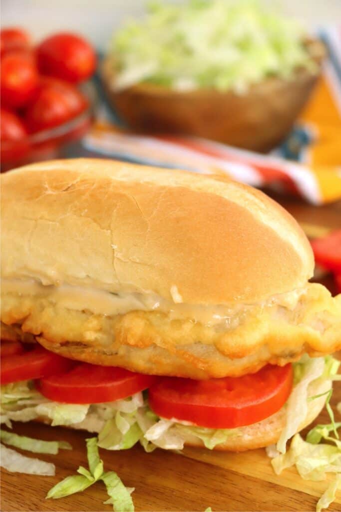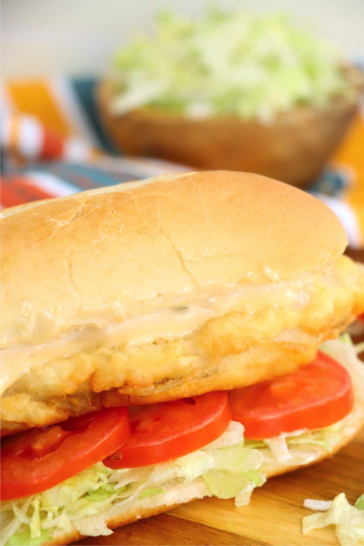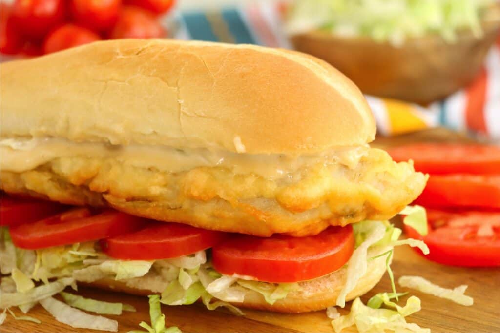 This catfish po boy is a classic Louisiana favorite with fried catfish, lettuce, tomatoes, and a zesty mayo spread.