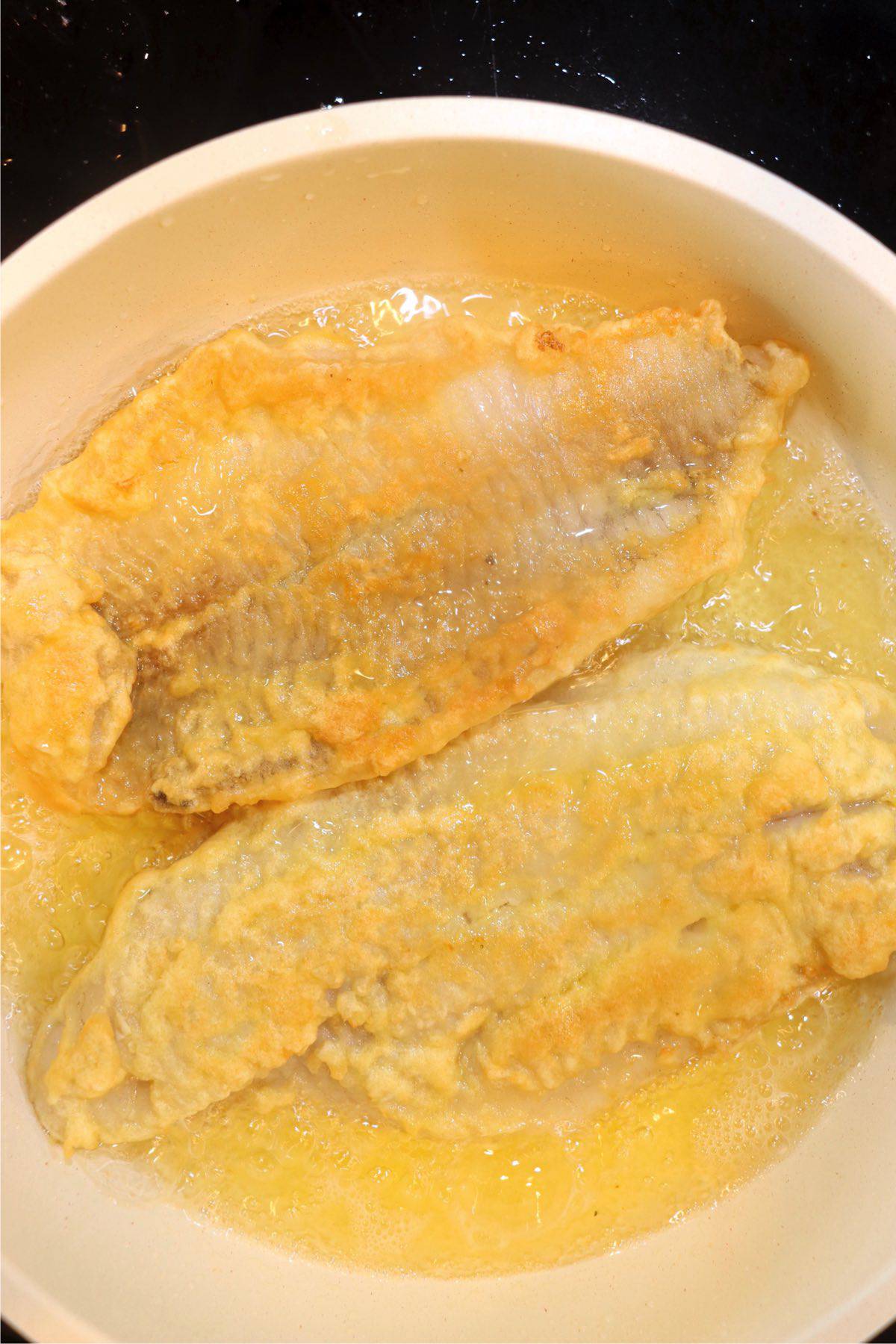 Only flip your fish one time while frying it. This helps get the batter nice and crispy and cooks the fish evenly.