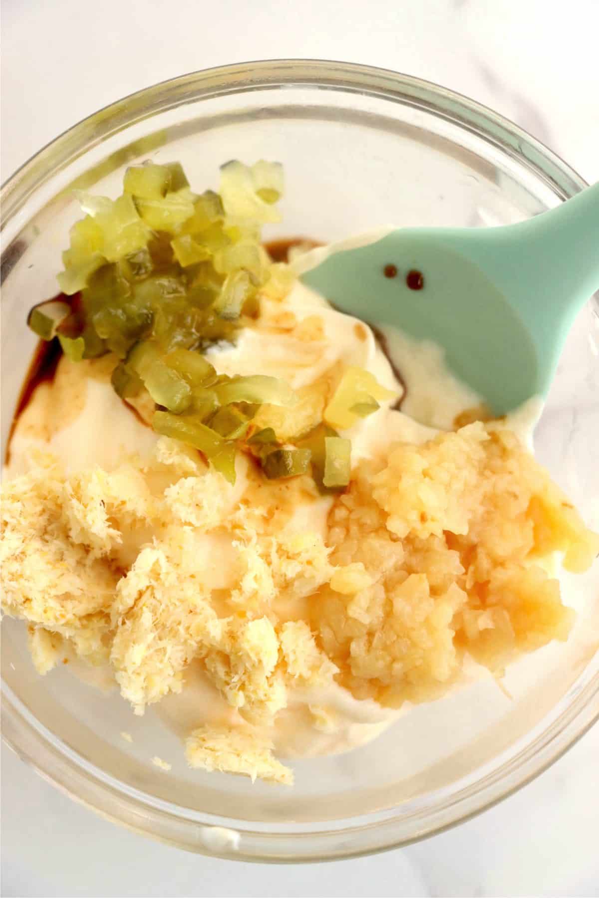 5: Combine the mayonnaise, pickle relish, garlic, horseradish, and Worcestershire sauce in a bowl.