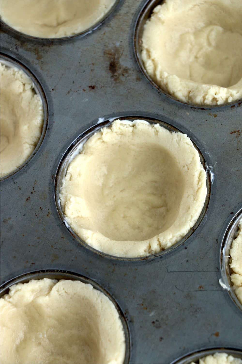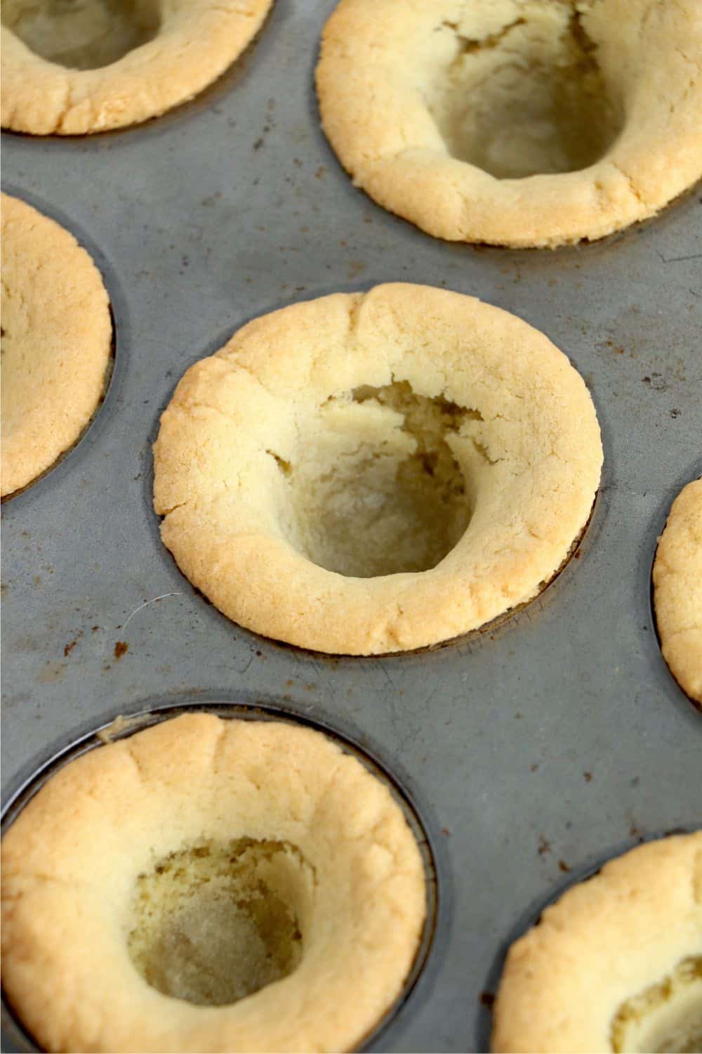 Step 6. Make balls of about 1/4 cup of dough. Press cookie dough in bottom and about 1/2 way up the sides of each muffin tin, forming a cup shape.