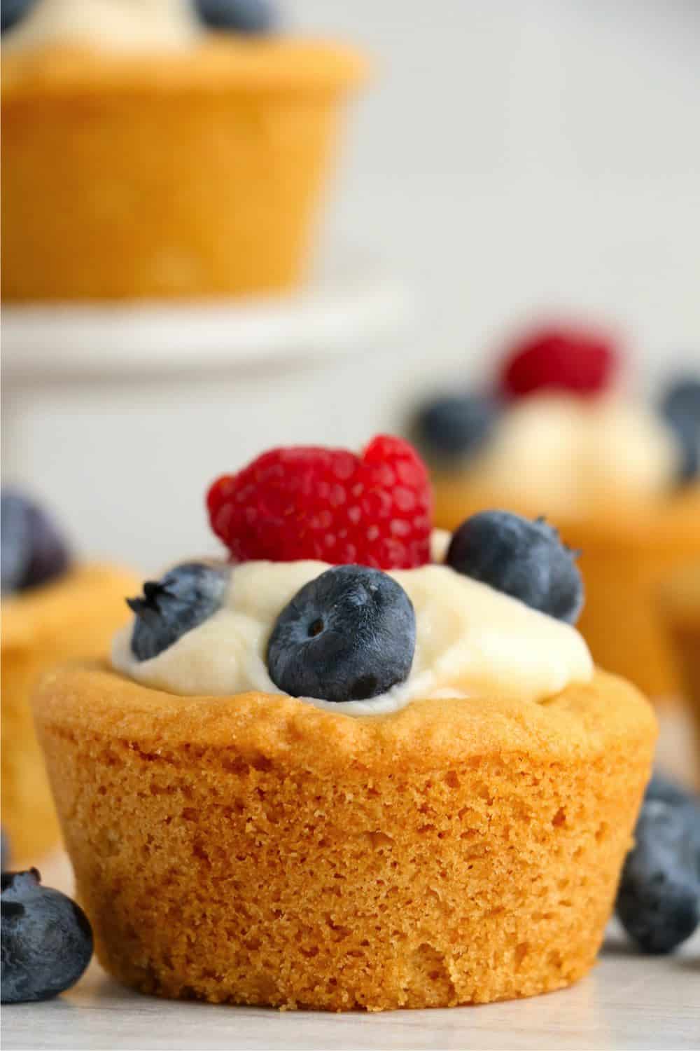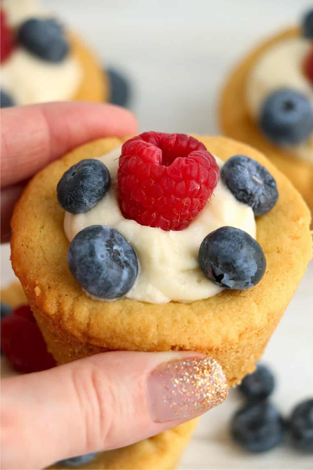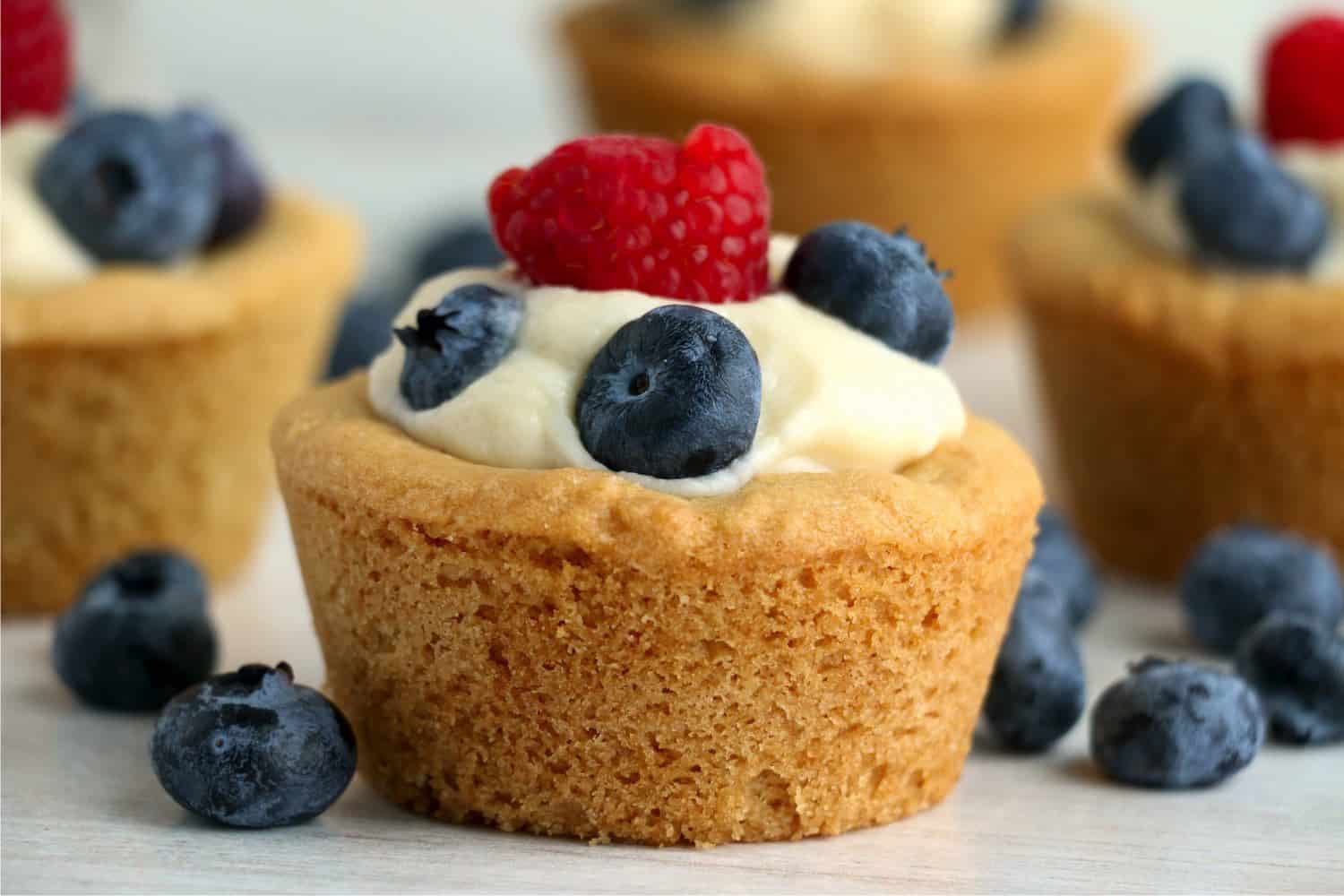 I topped my cookie cups with fresh berries. I like to use blueberries, raspberries and even sliced strawberries. You could also sprinkle them with sprinkles or crushed nuts for decoration purposes. Topping Sugar Cookies cups is up to you! One of the best things about these delicious personalized sized desserts is that you can customize your toppings however you prefer.