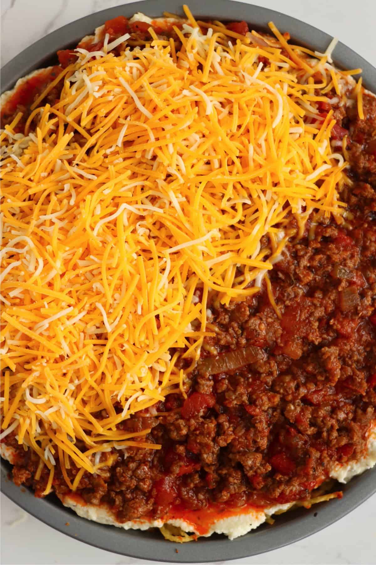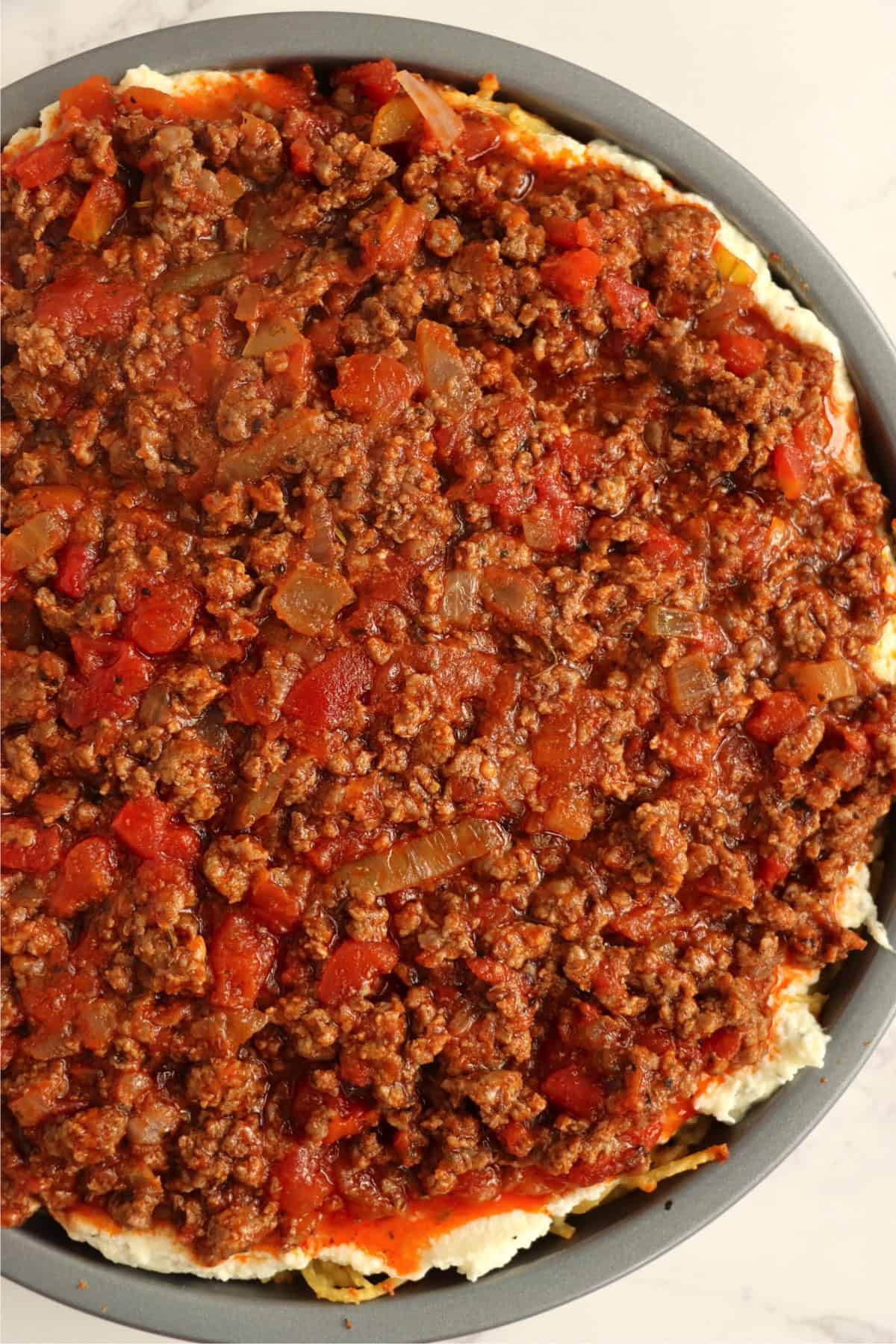 - Be careful when spreading the meat sauce over the ricotta to avoid mixing it together.