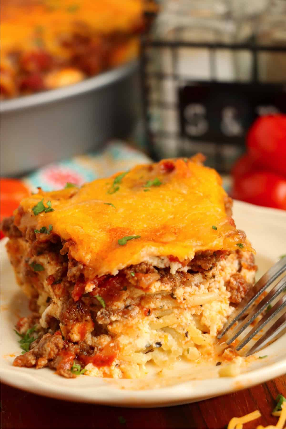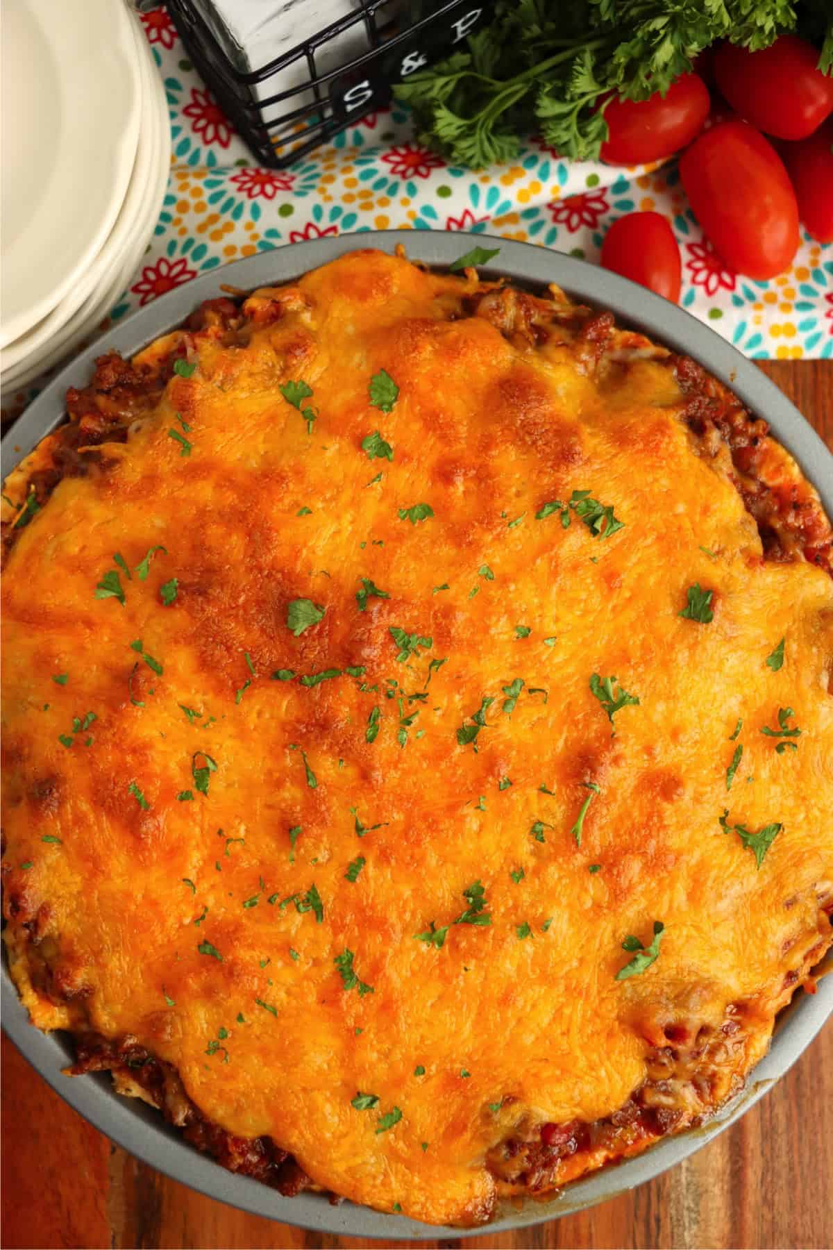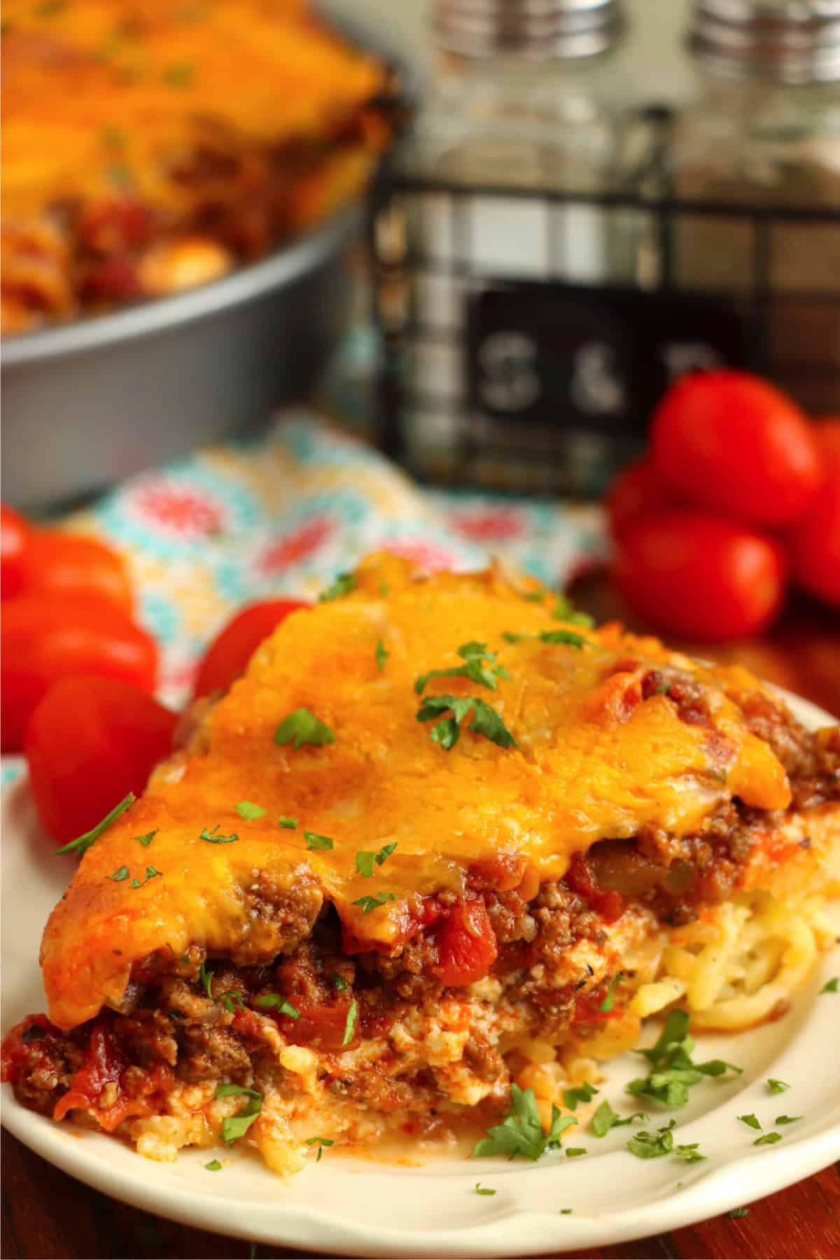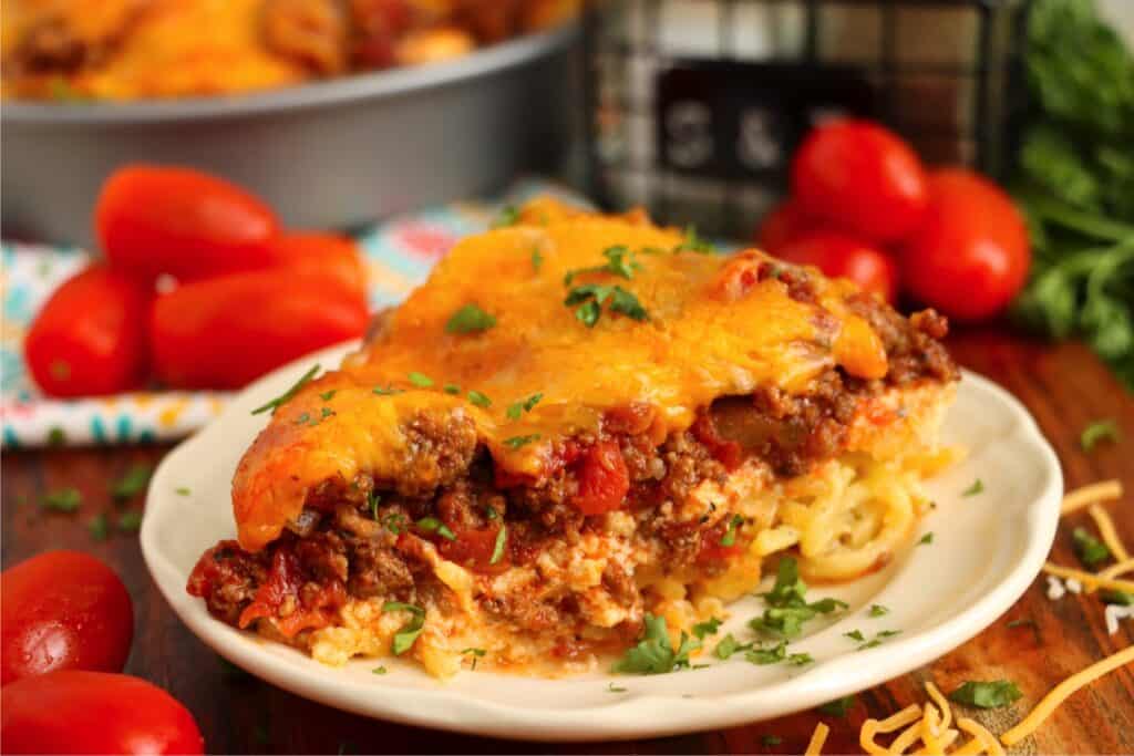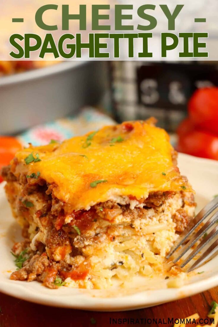 This cheesy spaghetti pie is a delicious classic with a spaghetti noodle crust, rich meaty sauce, and tons of cheese.