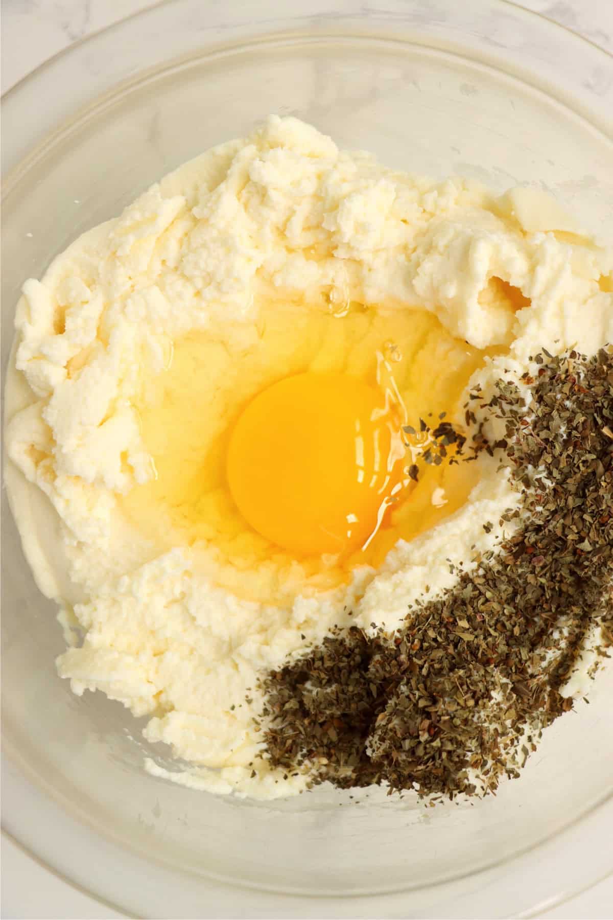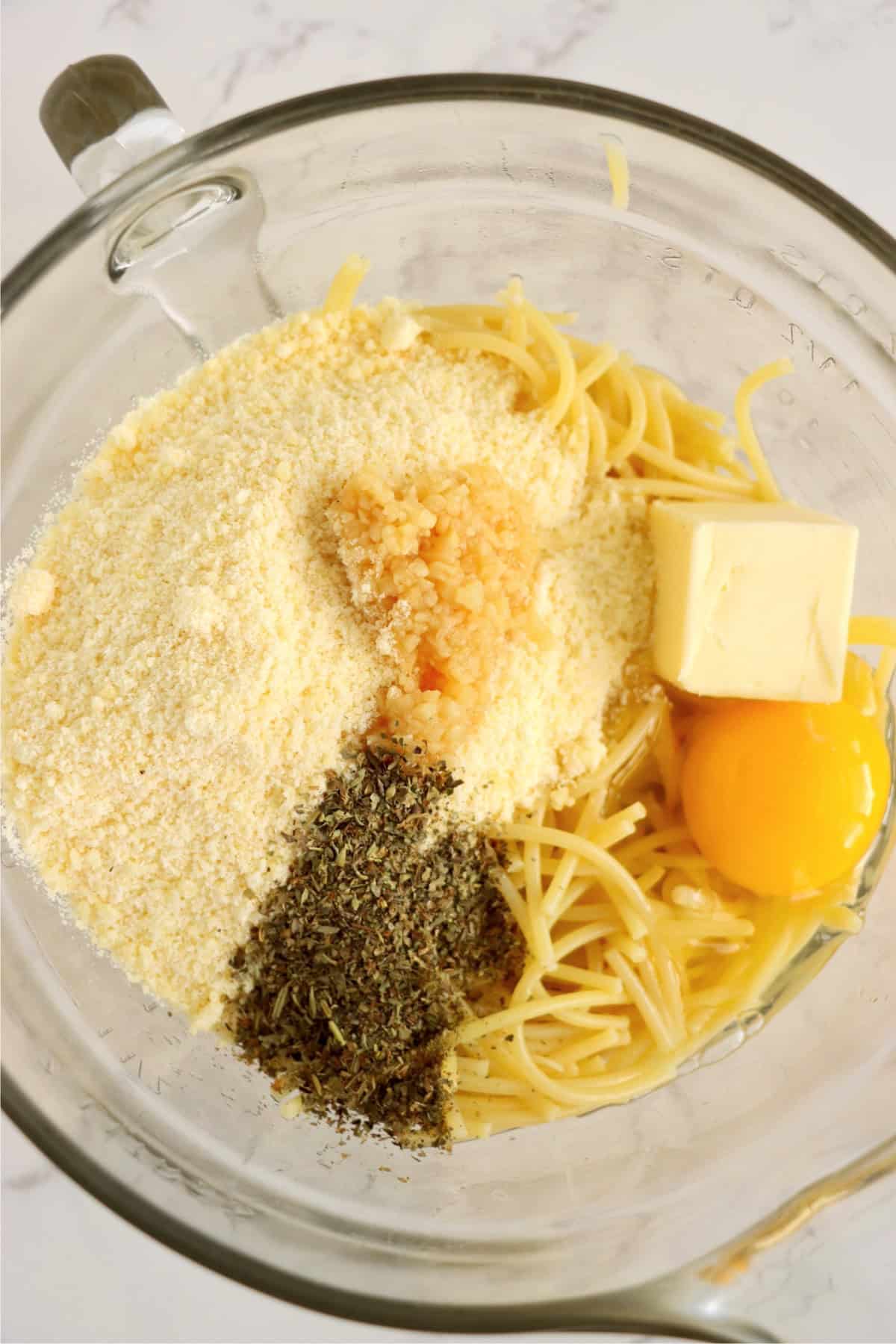- In a large bowl, combine cooked spaghetti, garlic, butter, Parmesan cheese, egg, and Italian seasoning.
