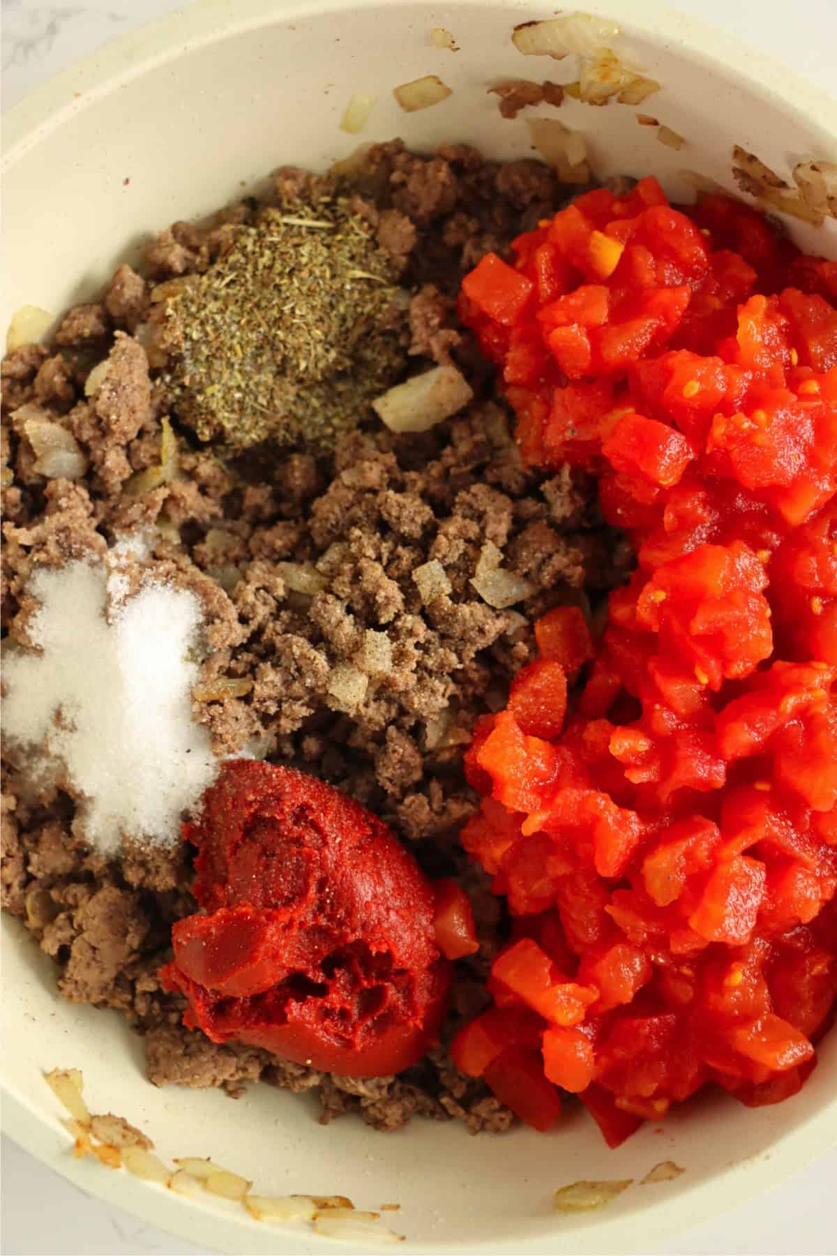 3: Add the diced tomatoes, tomato paste, and sugar and simmer until thickened. Then, add the Italian seasoning, salt, and pepper and mix.