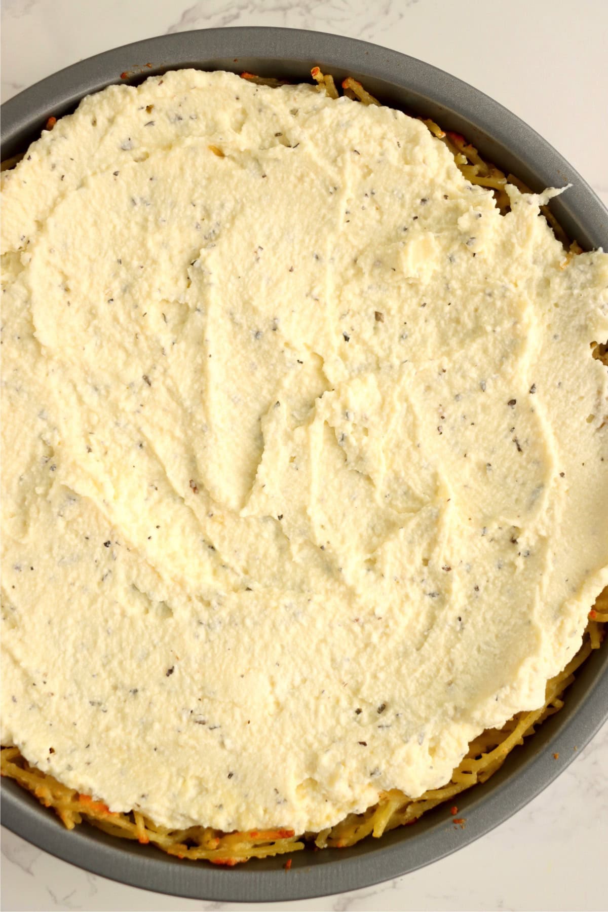 Spaghetti pie is a variation of spaghetti that uses spaghetti as a crust and tops it with ricotta, meat sauce, and cheese.