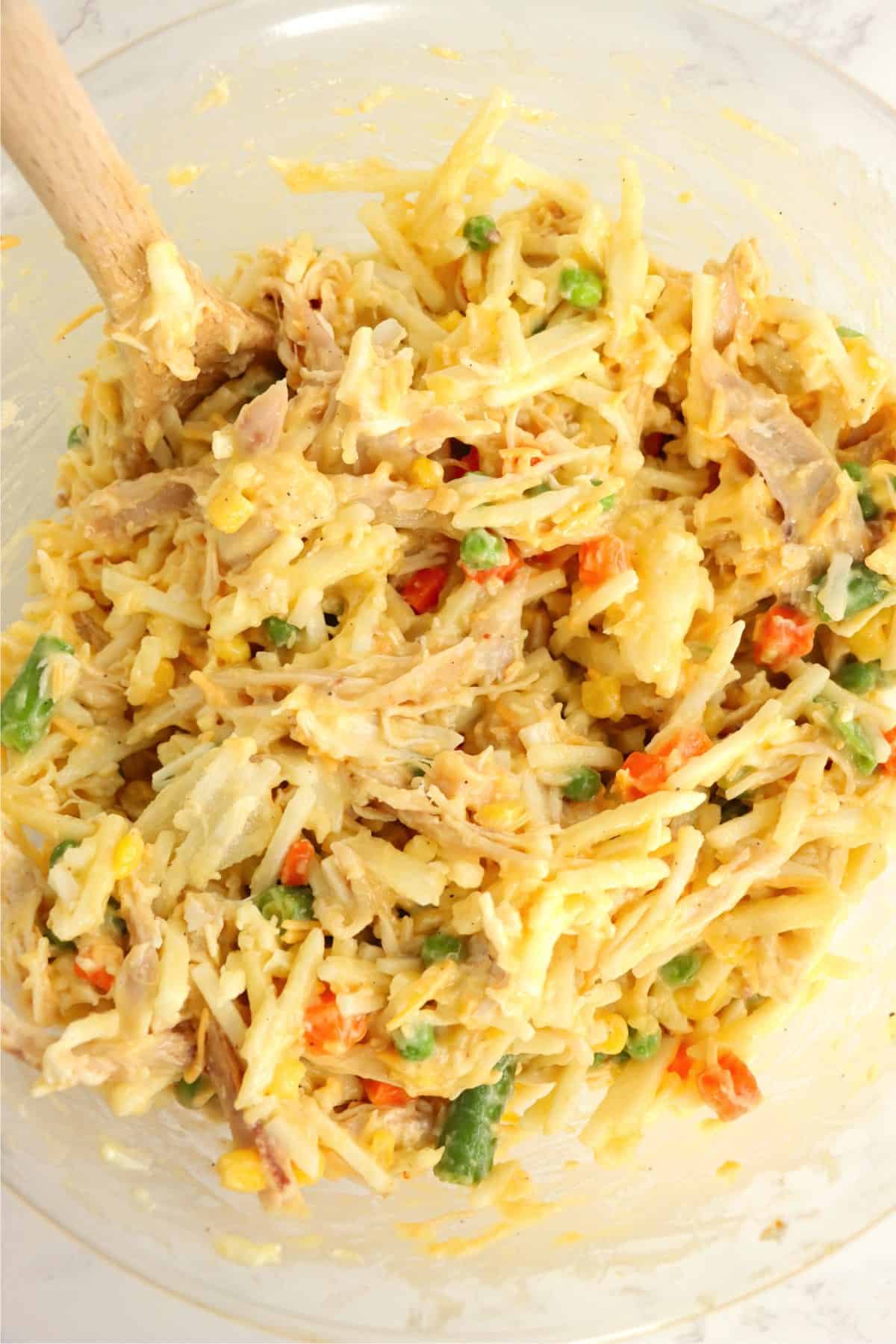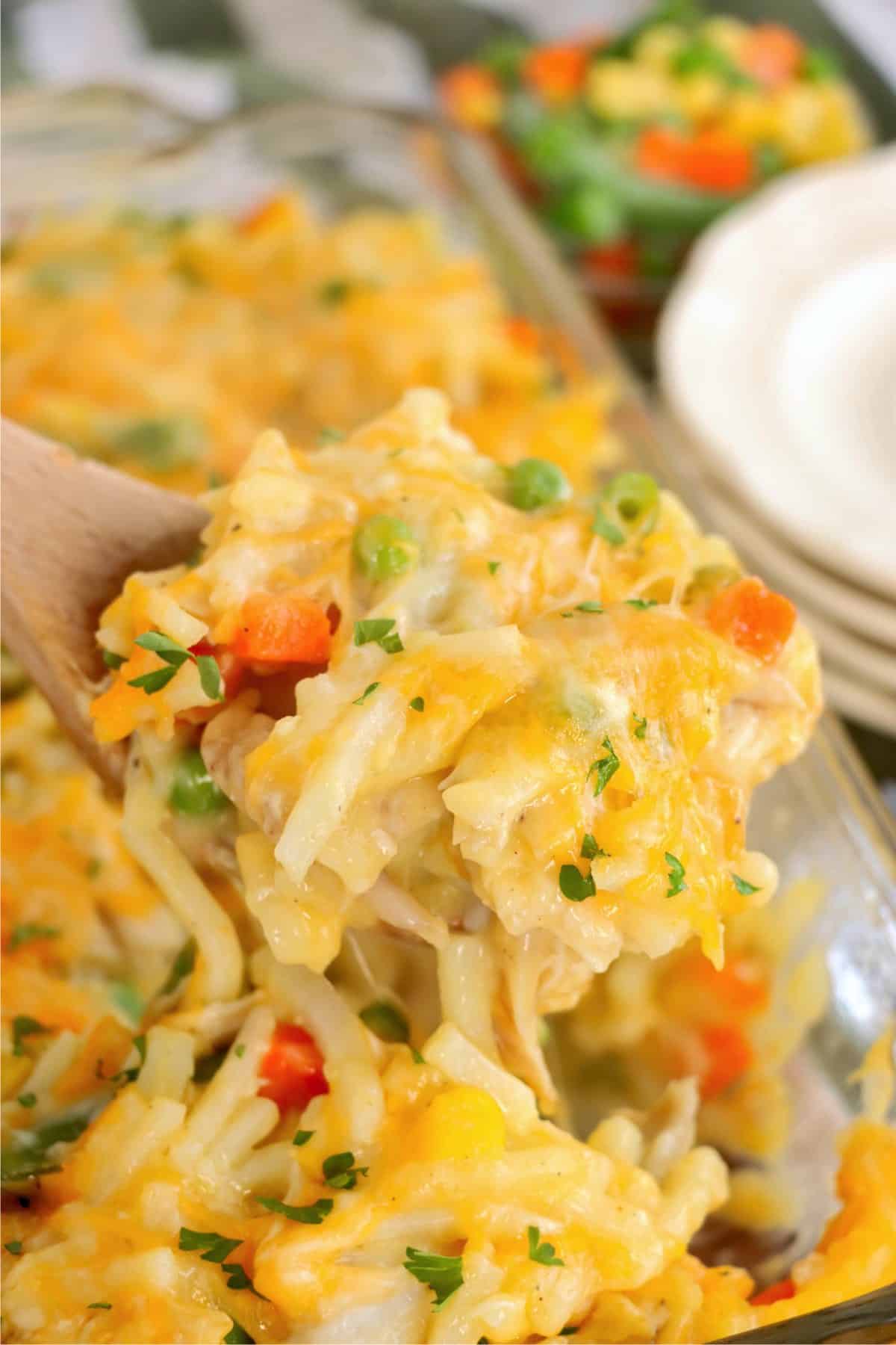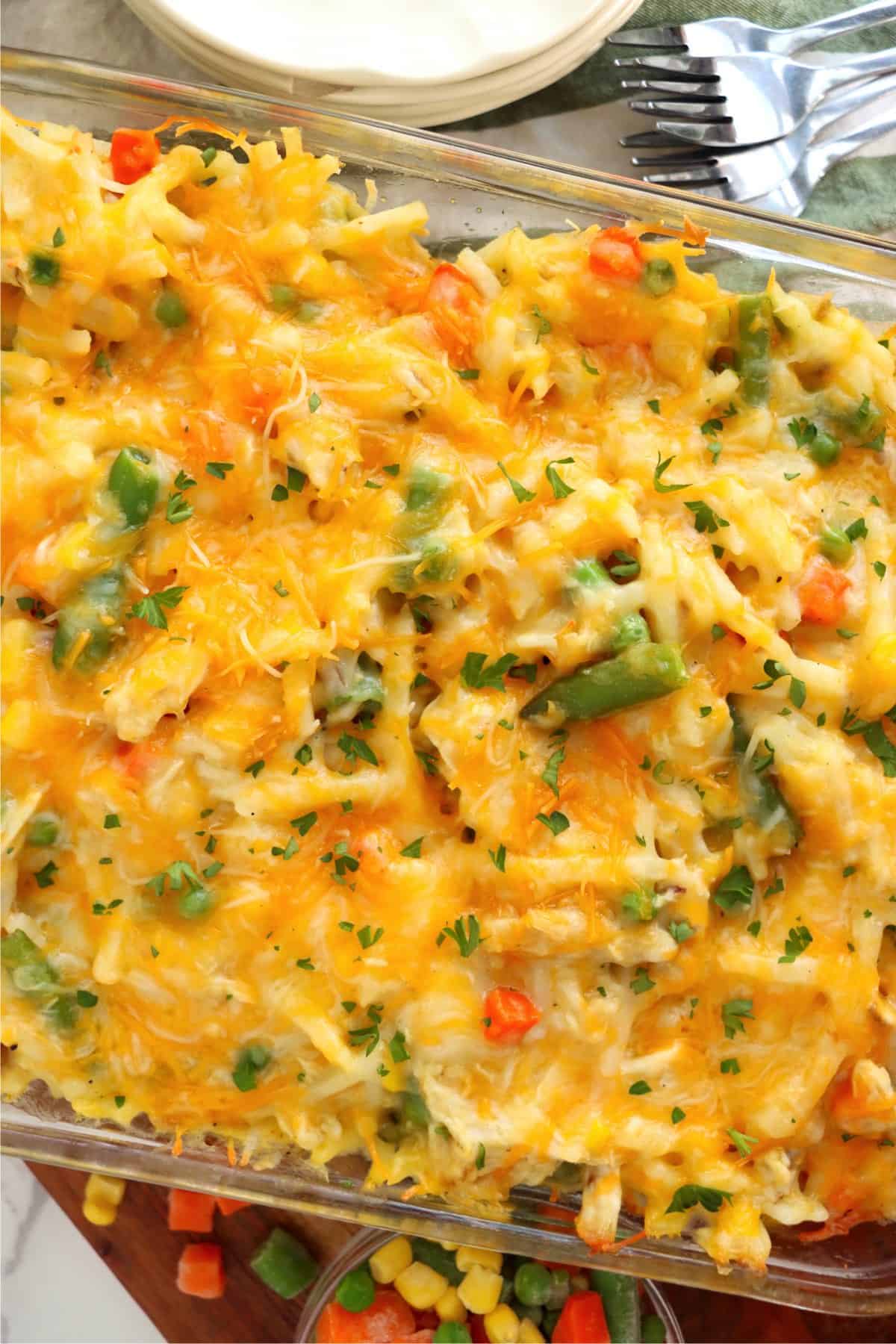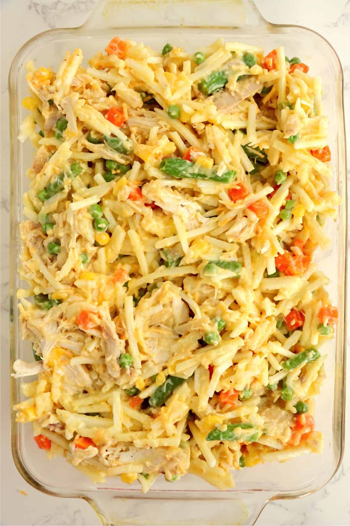 Chicken hash brown casserole is a variation of classic hash brown casserole made with the base casserole ingredients of hash browns, creamed soup, and cheese. Then, I add shredded chicken and frozen vegetables.
