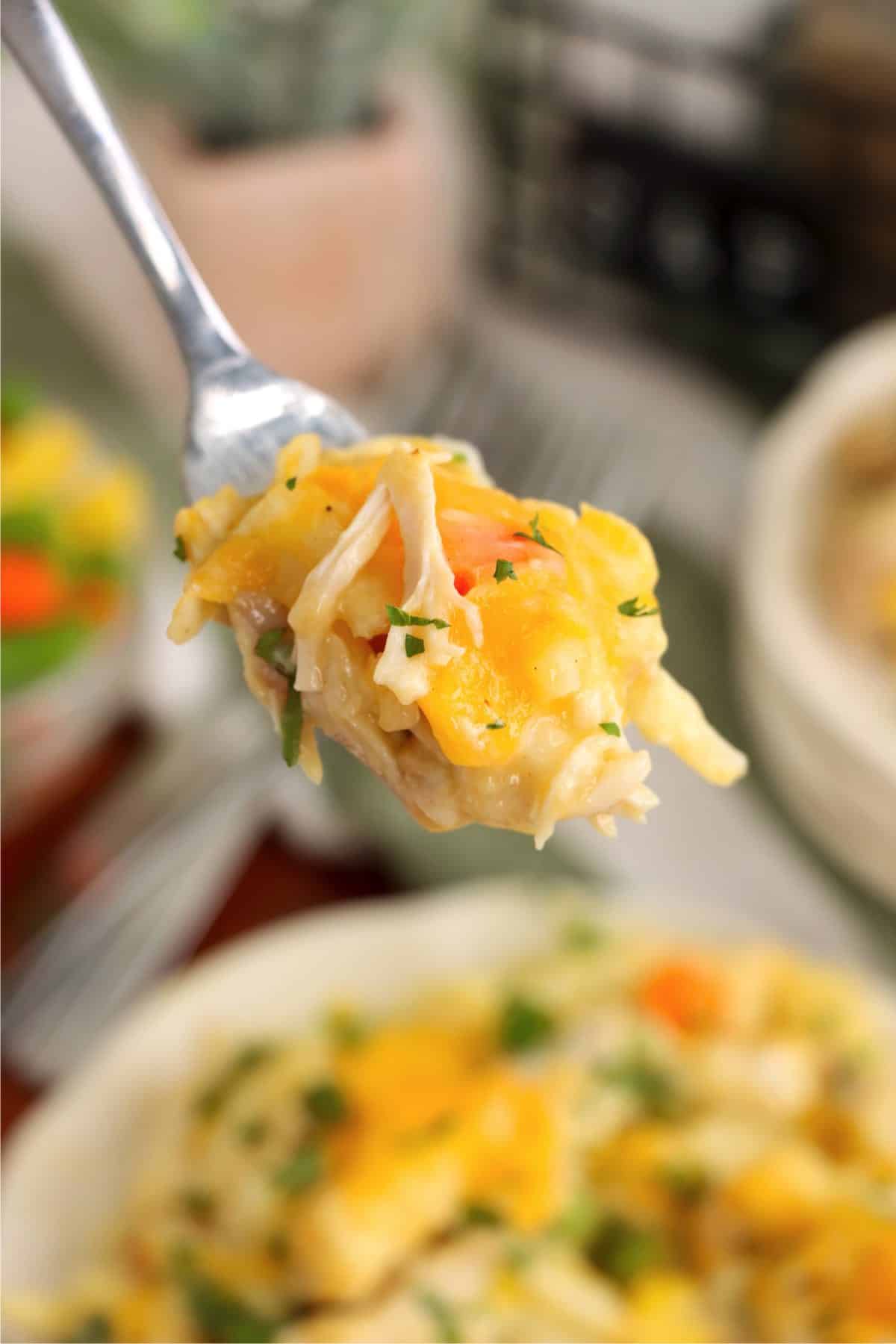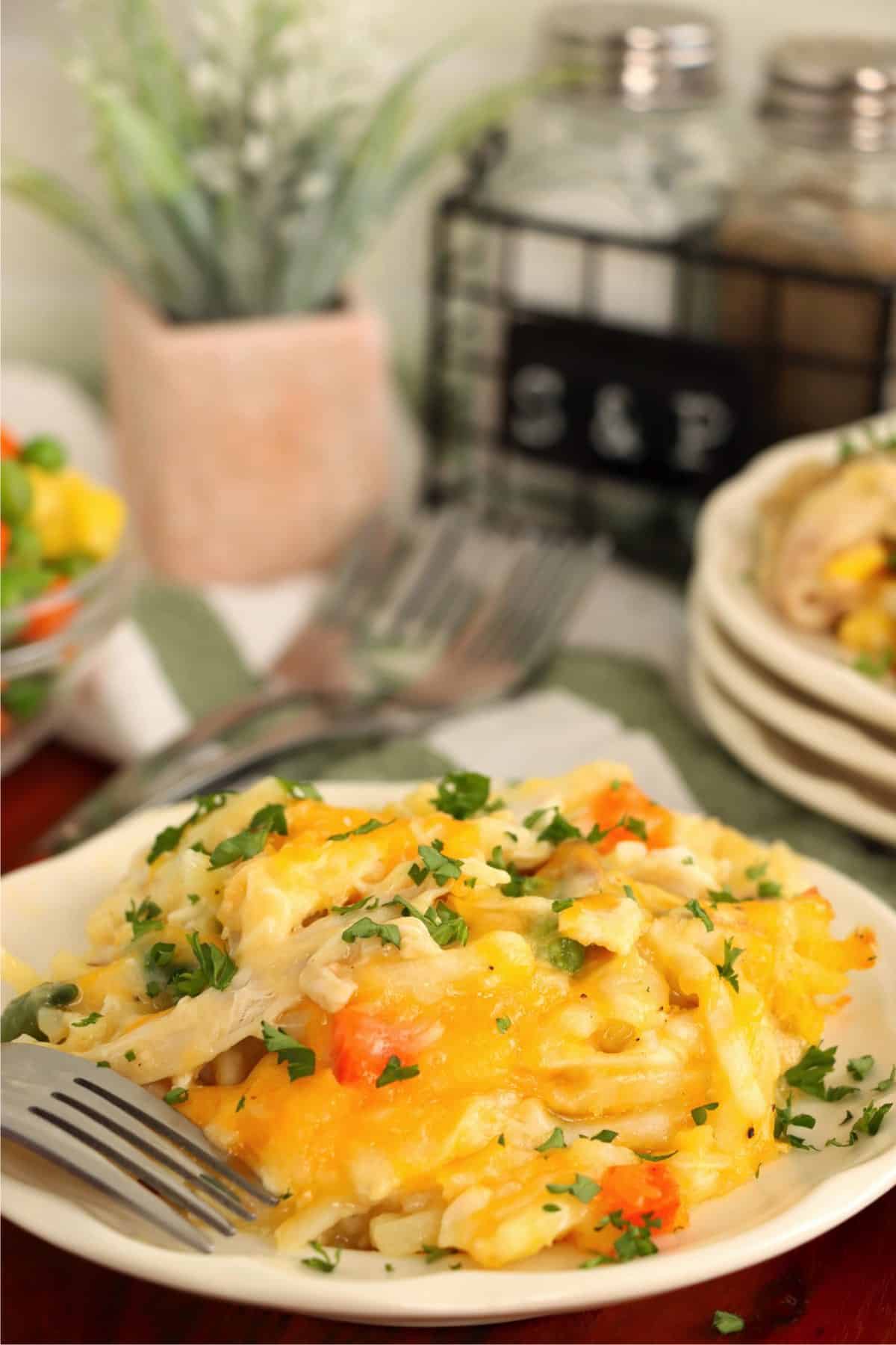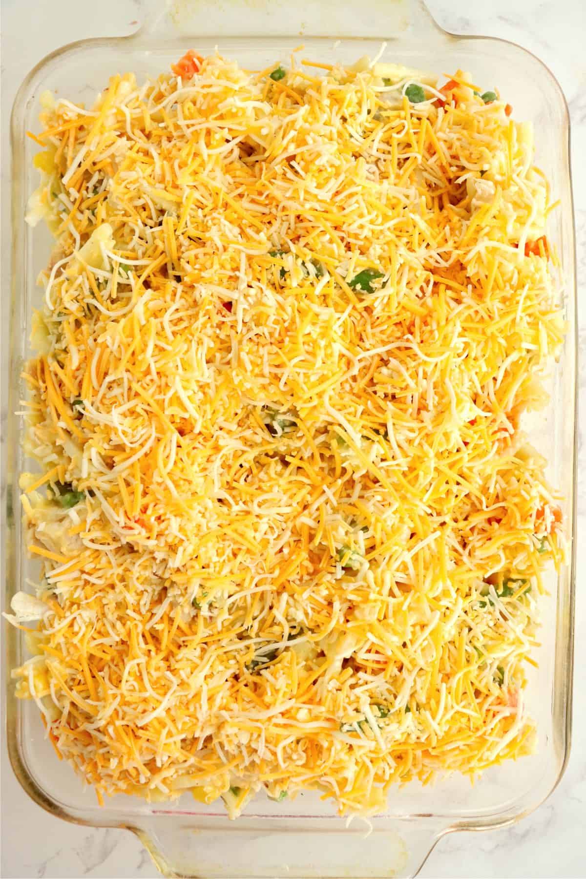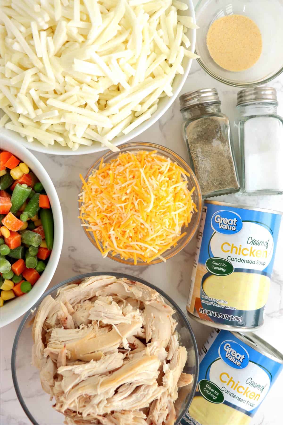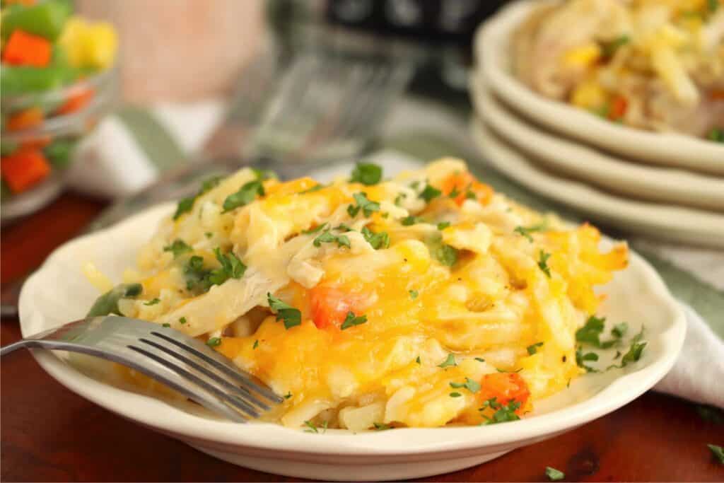 Chicken hash brown casserole is a variation of classic hash brown casserole made with the base casserole ingredients of hash browns, creamed soup, and cheese. Then, I add shredded chicken and frozen vegetables.