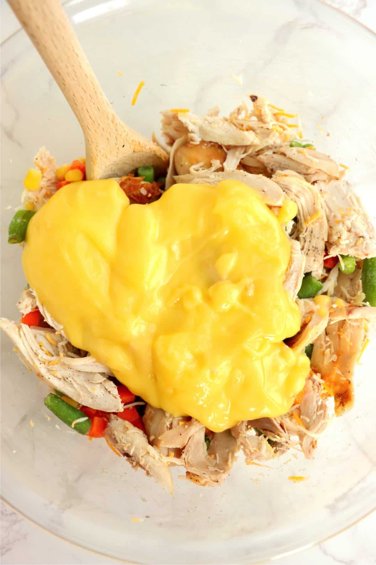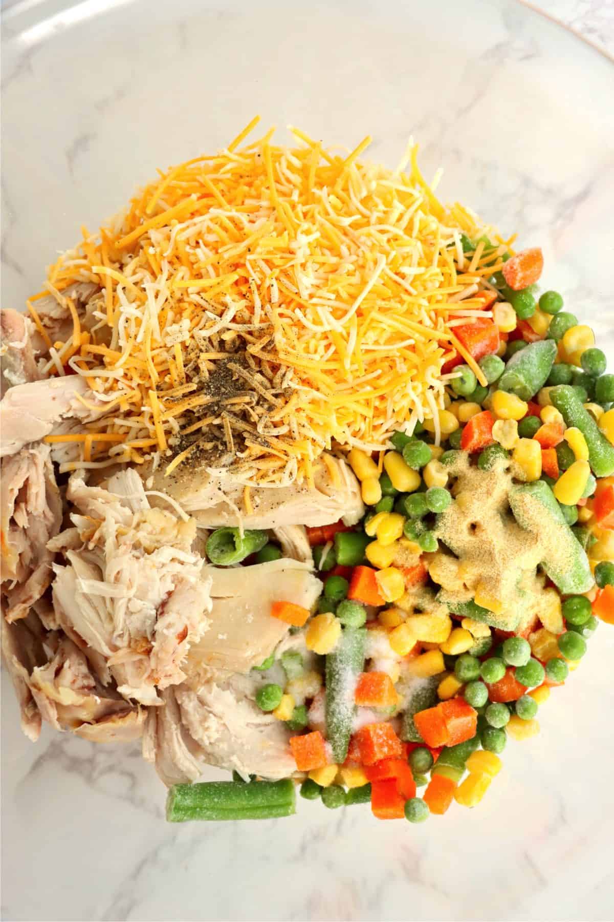 - In a large bowl, combine chicken, frozen vegetables, 1 cup shredded cheese, garlic powder, salt, and pepper. Stir well.