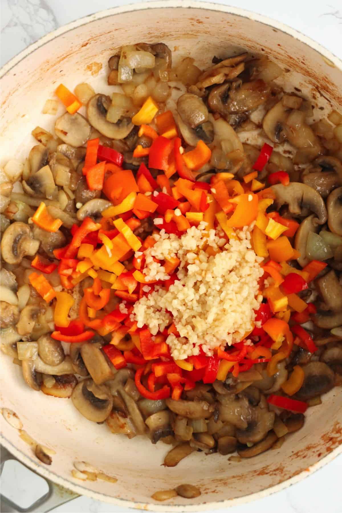 - Add peppers and garlic. Continue cooking and stirring for 2 minutes. Do not allow garlic to burn.