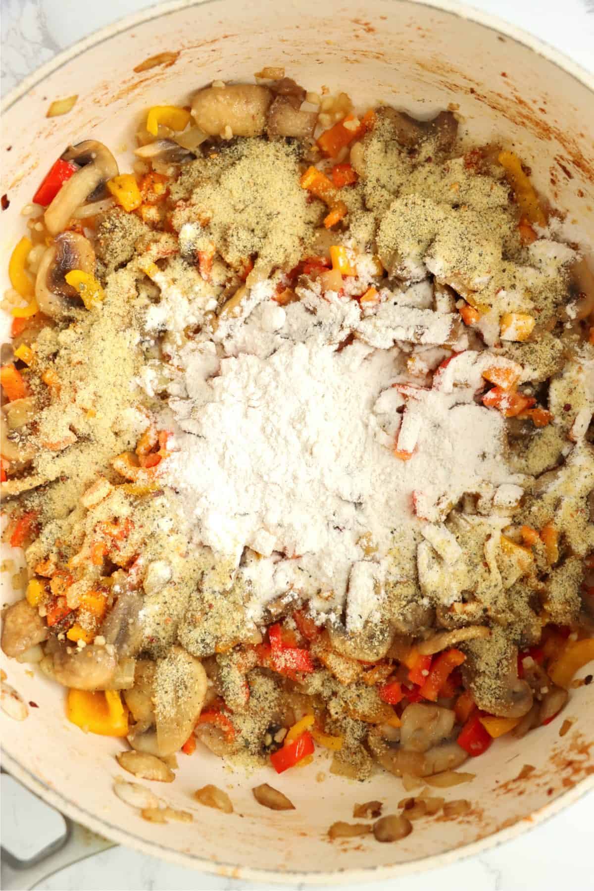- Sprinkle flour and Italian seasoning over mushroom mixture. Stir.