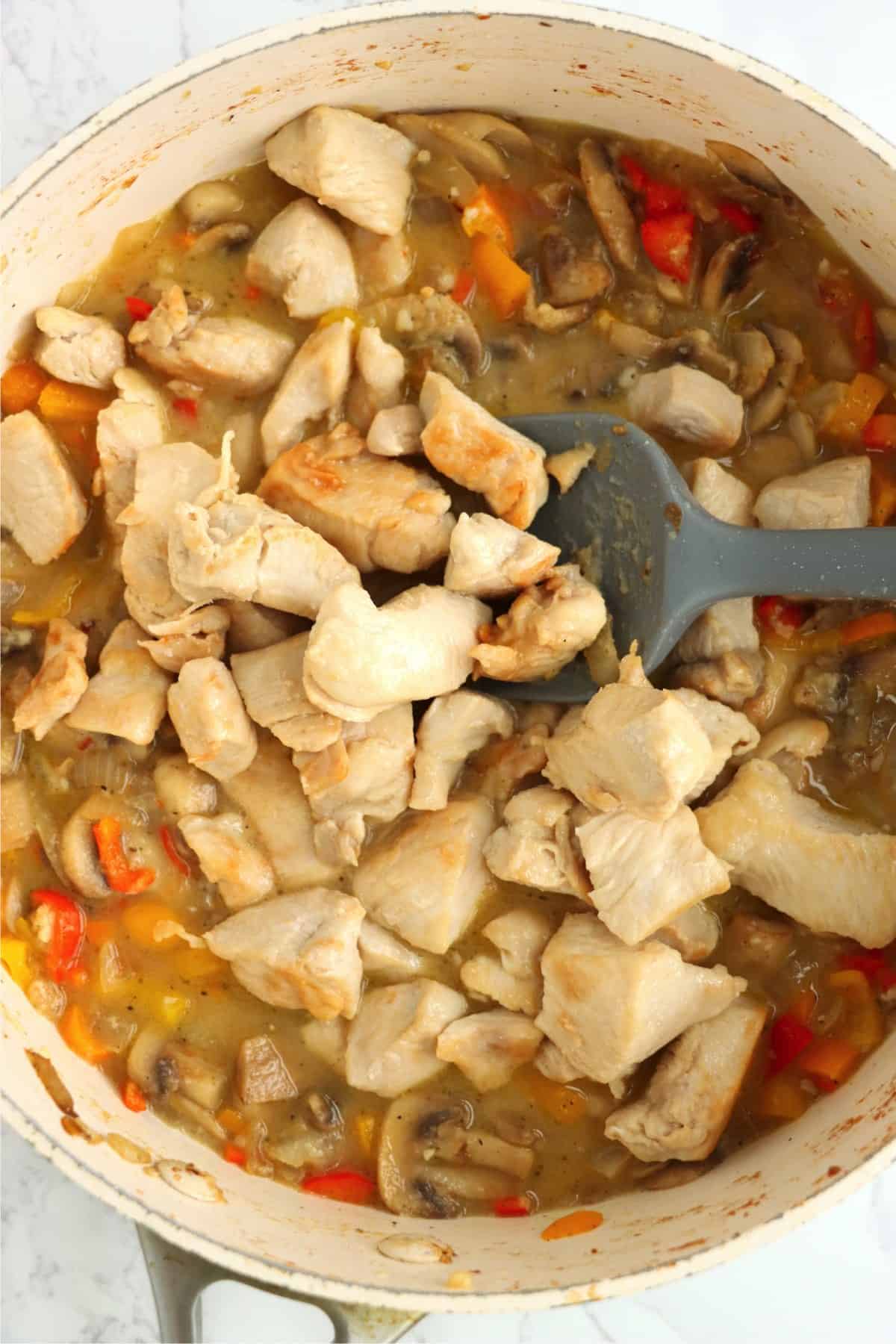 - Add cooked chicken and chicken broth. Stir.