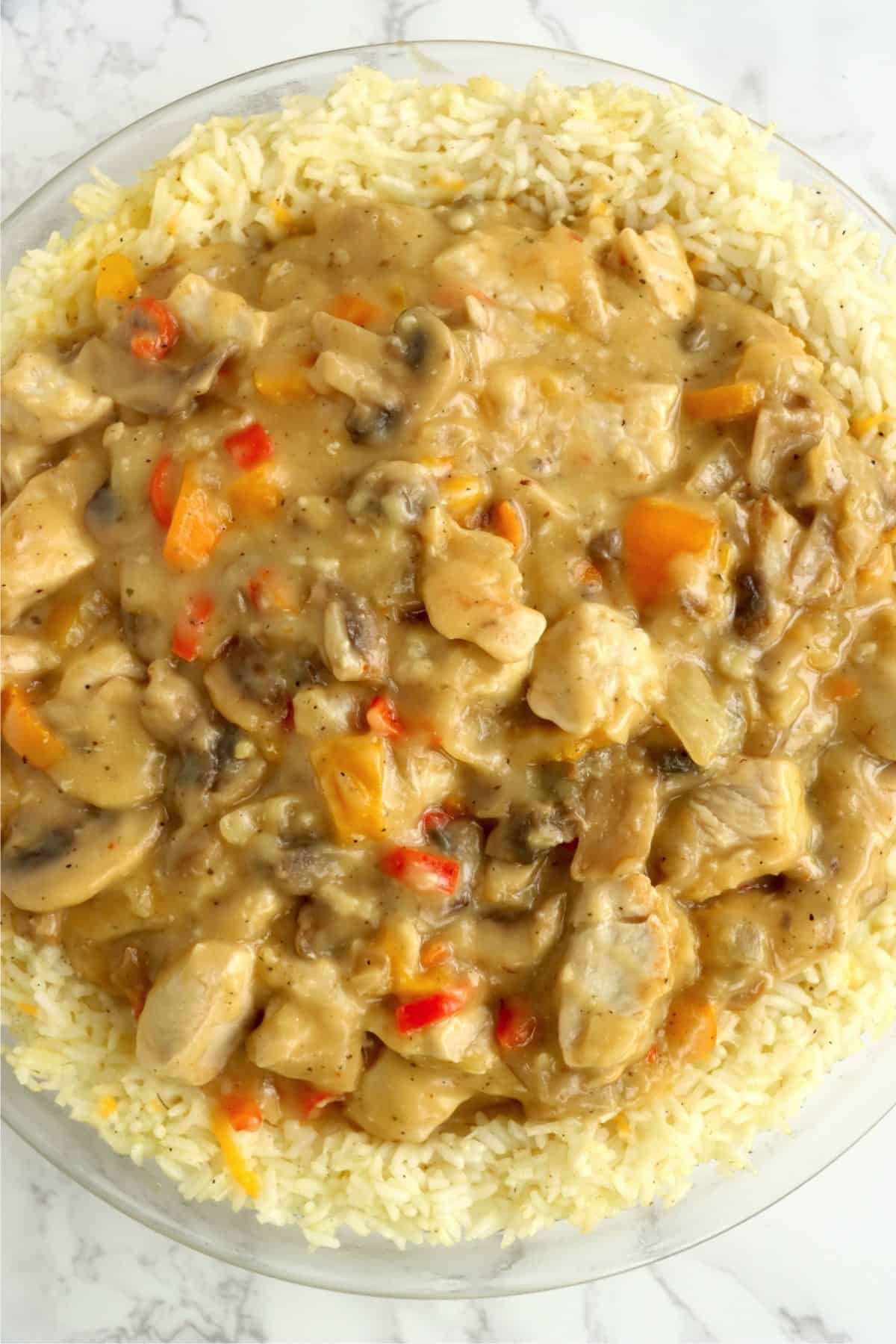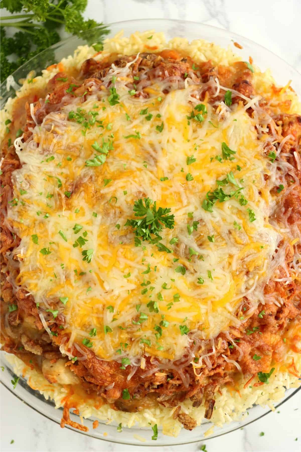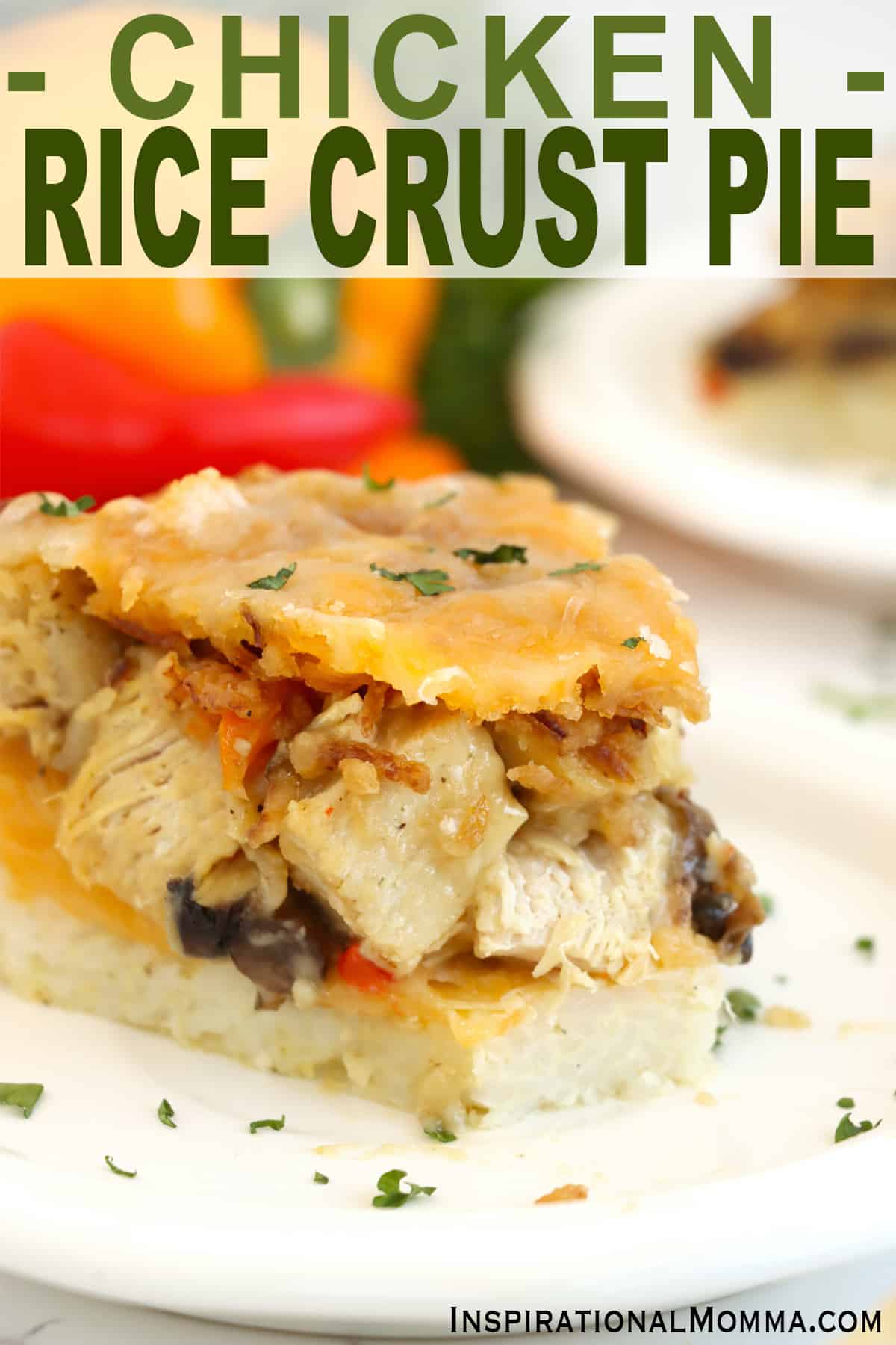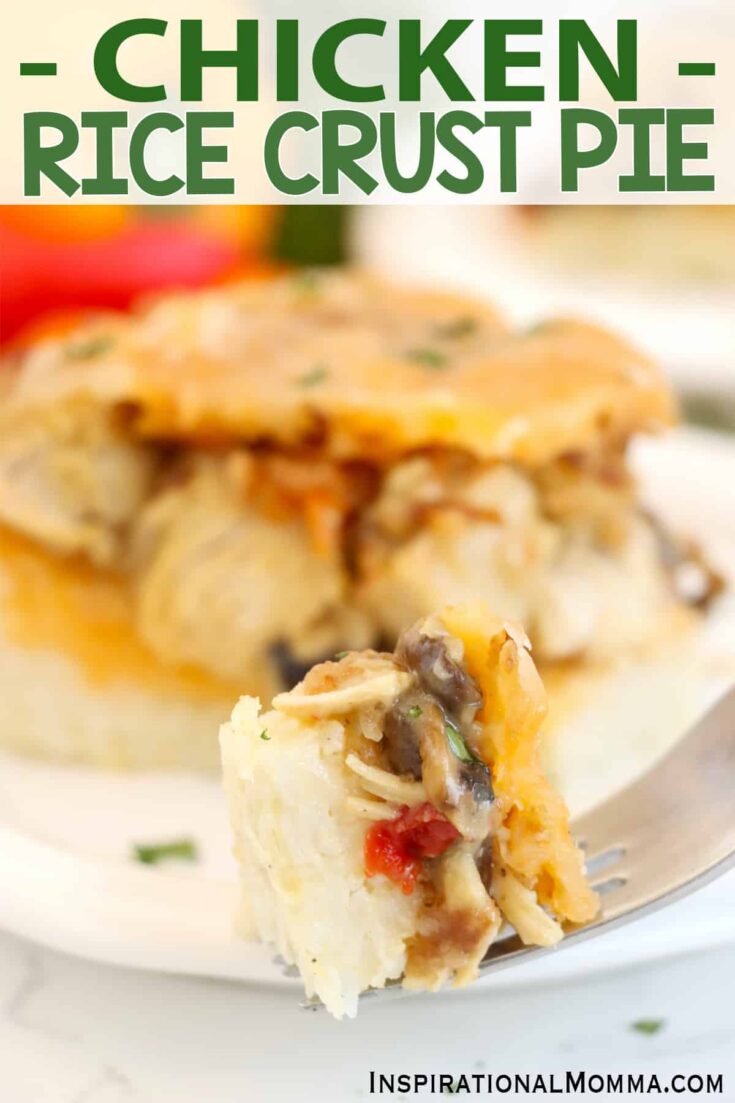 Chicken rice crust pie is a new twist on classic chicken and rice. The crust is rice, and the topping is classic, creamy chicken and cheese.