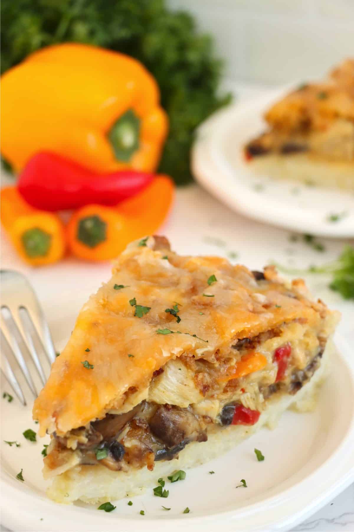 This chicken rice crust pie takes classic chicken and rice and turns it on its head. A rice crust is topped with cheese, a creamy chicken and veggie mix, and even more cheese.