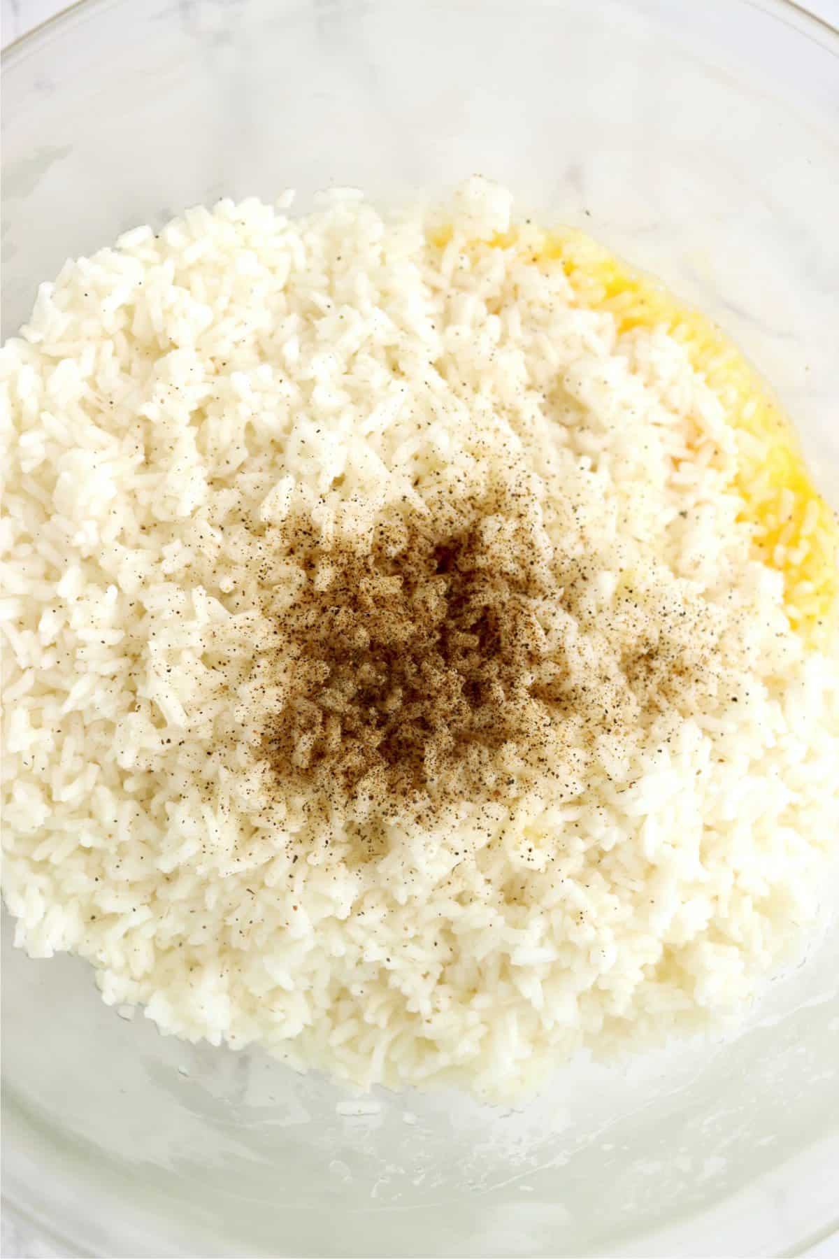 1: Thoroughly combine the rice, pepper, and eggs.