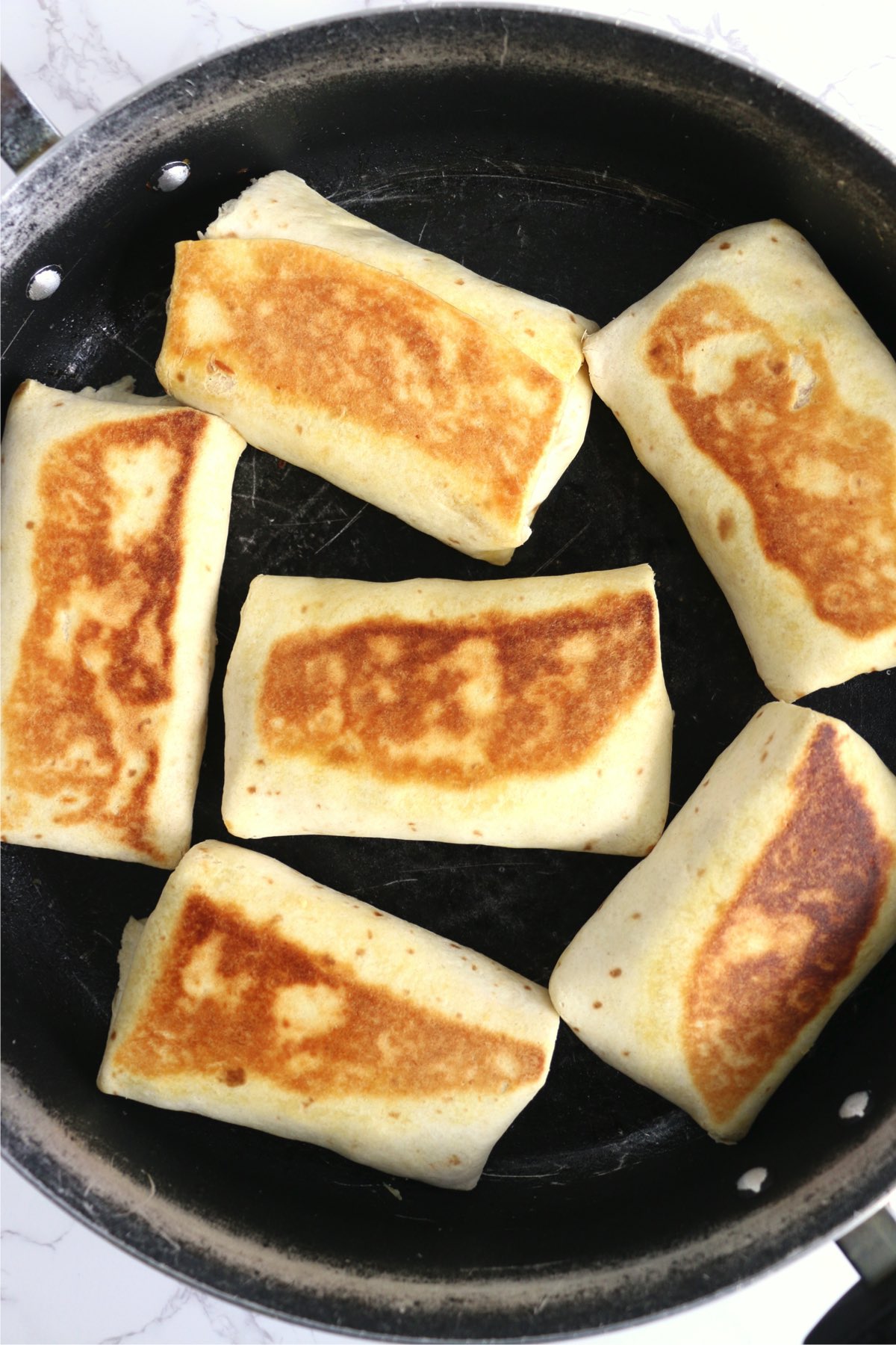 - Spray the tops of snack wraps and flip to cook the other side. Continue cooking until that side is golden brown.