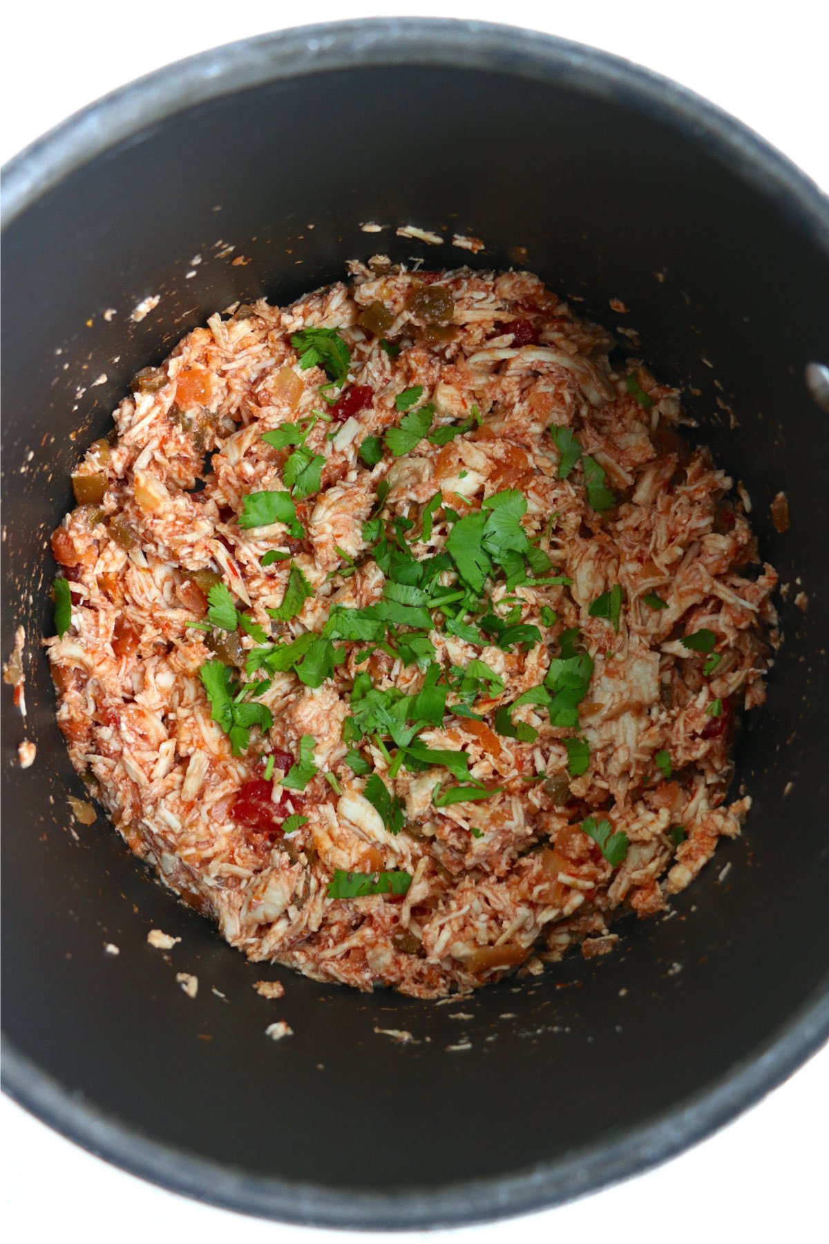 - In a large saucepan over medium heat, combine shredded chicken and salsa. Cook for a few minutes until mixture is heated through. Remove from heat, stir in 3 tablespoons cilantro, and set aside.