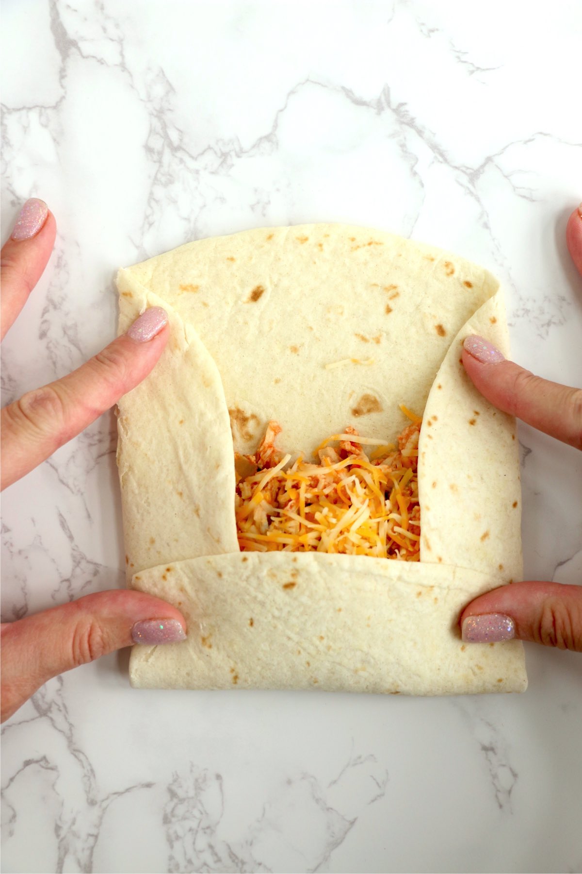 - To fold your snack wrap, fold the sides in and roll to secure. Place seam-side down until you are finished rolling them all up.