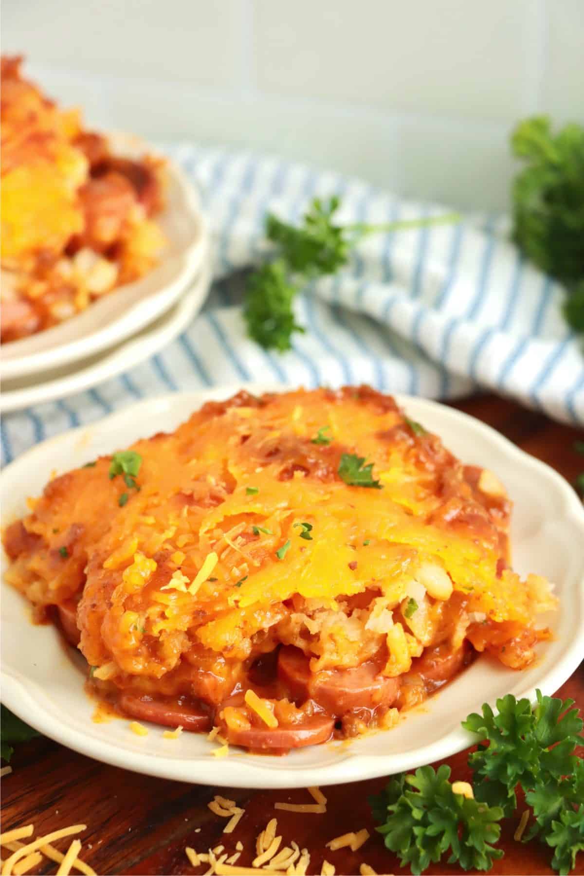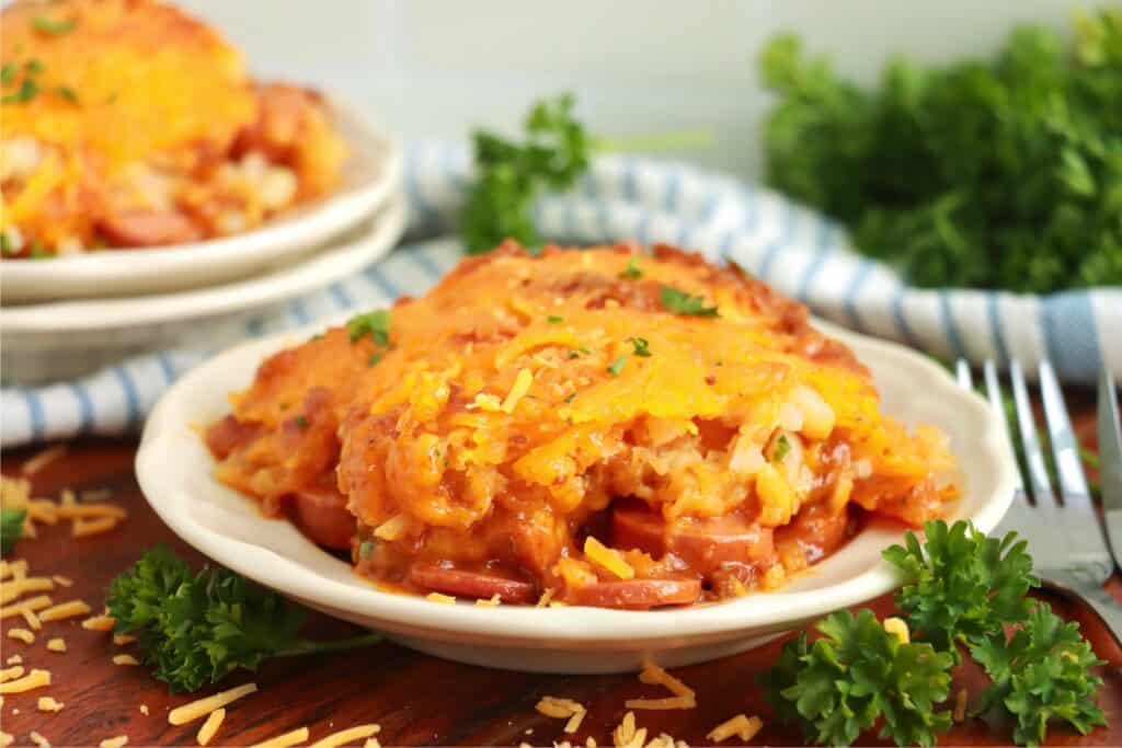 This tater tot hot dog casserole is essentially a casserole that combines tots and chili cheese dogs into one delicious dish.