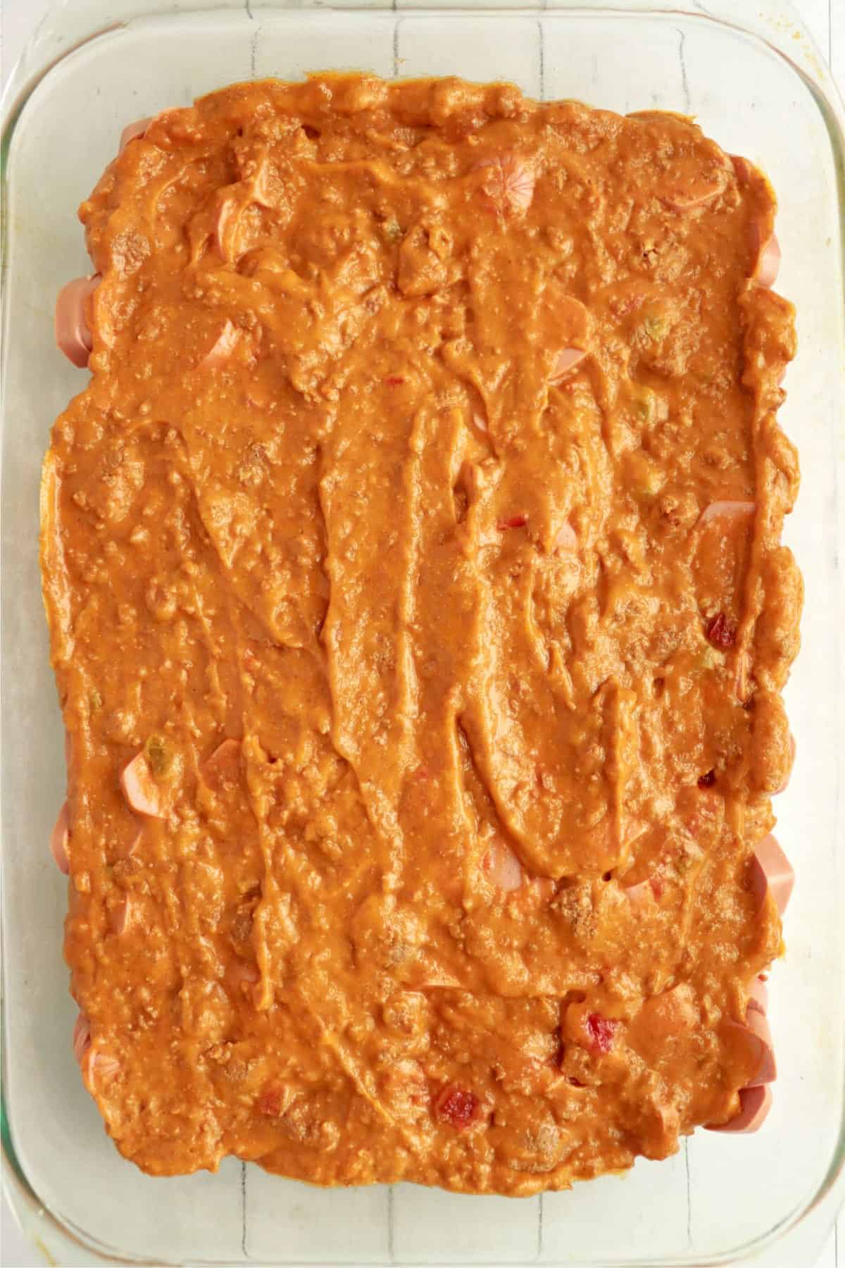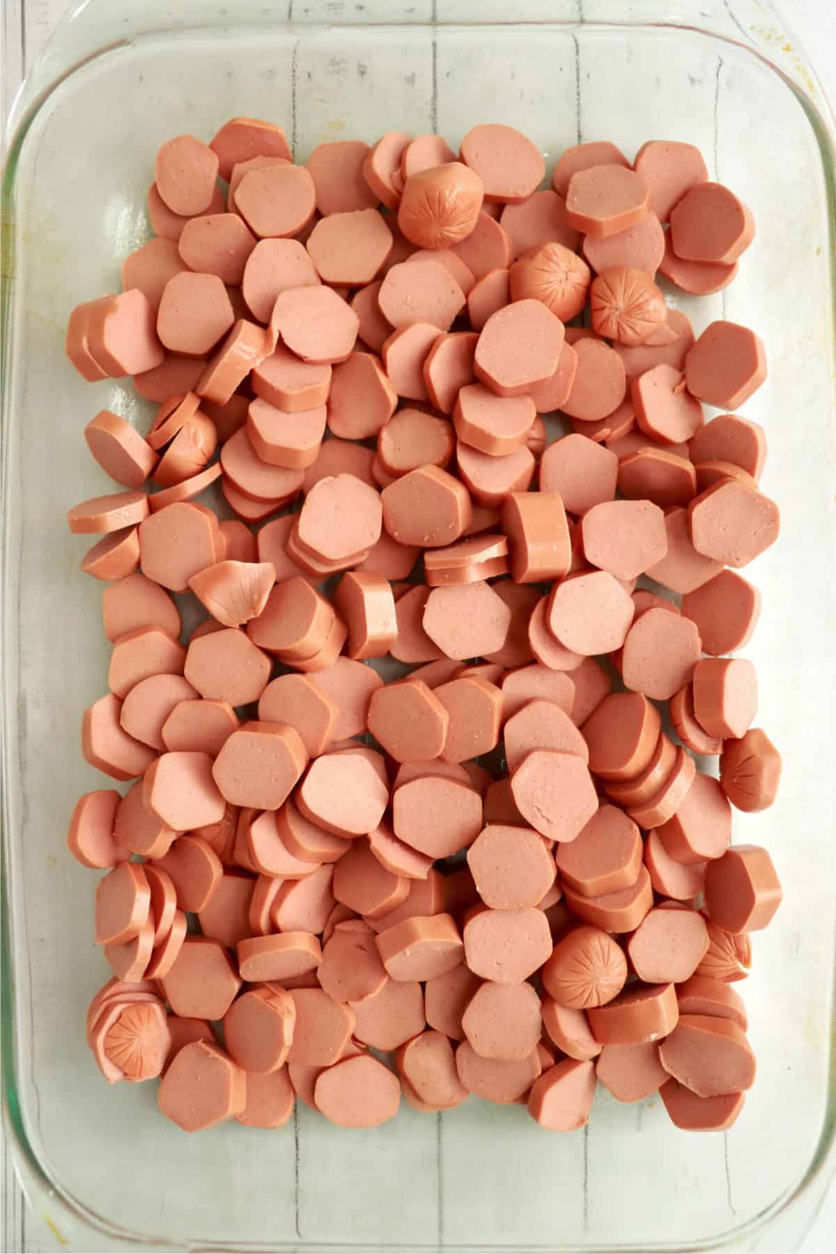 - Put sliced hot dogs in baking dish.