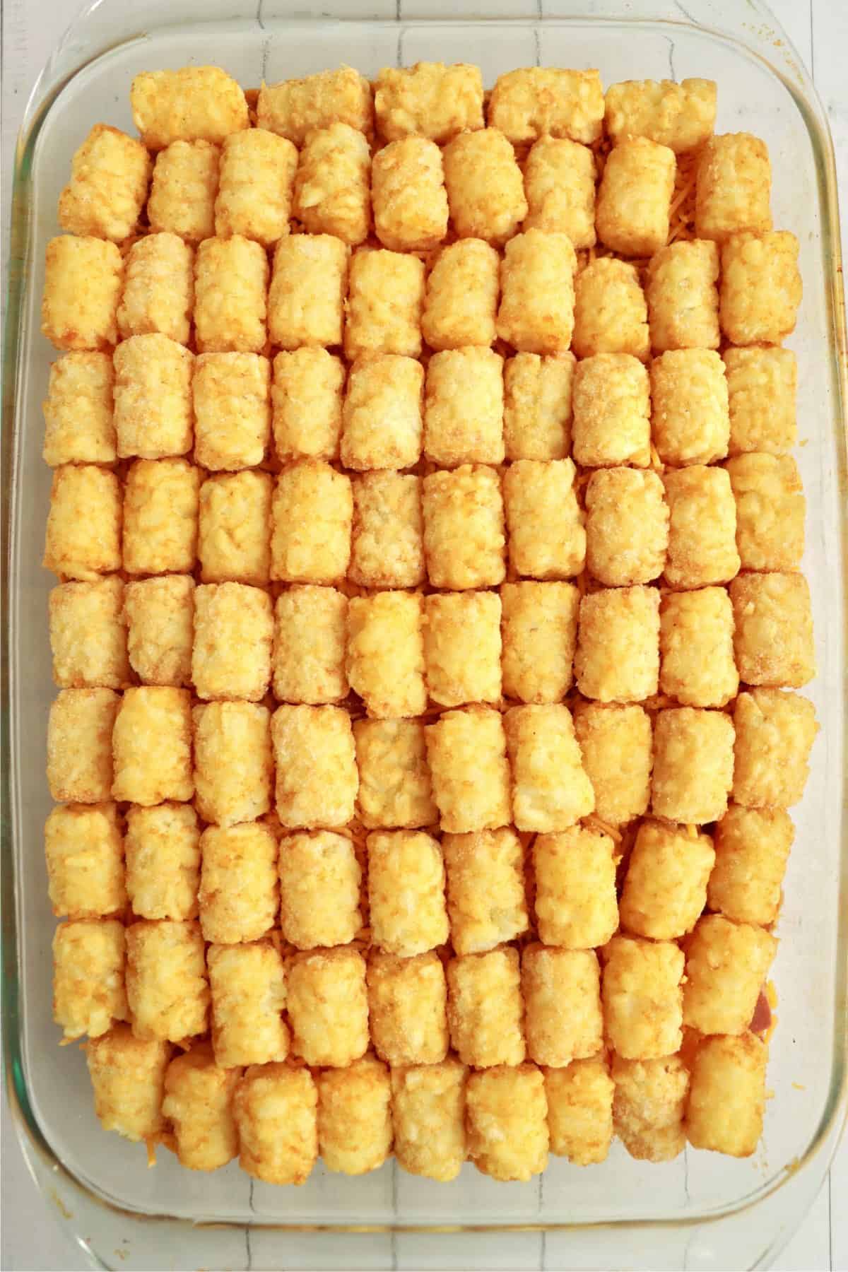 - Make rows of tater tots, covering the entire pan.
