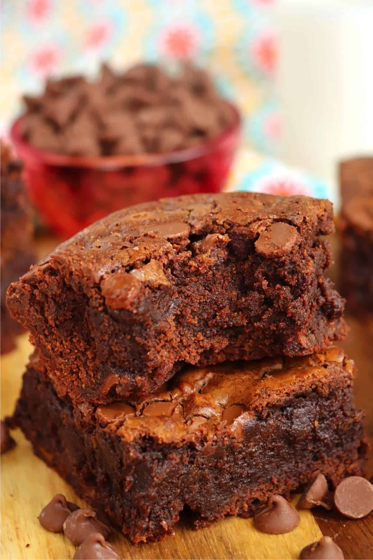 These chocolate chip brownies are super moist and rich with a double shot of chocolate, thanks to chocolate chips in the batter and on top!