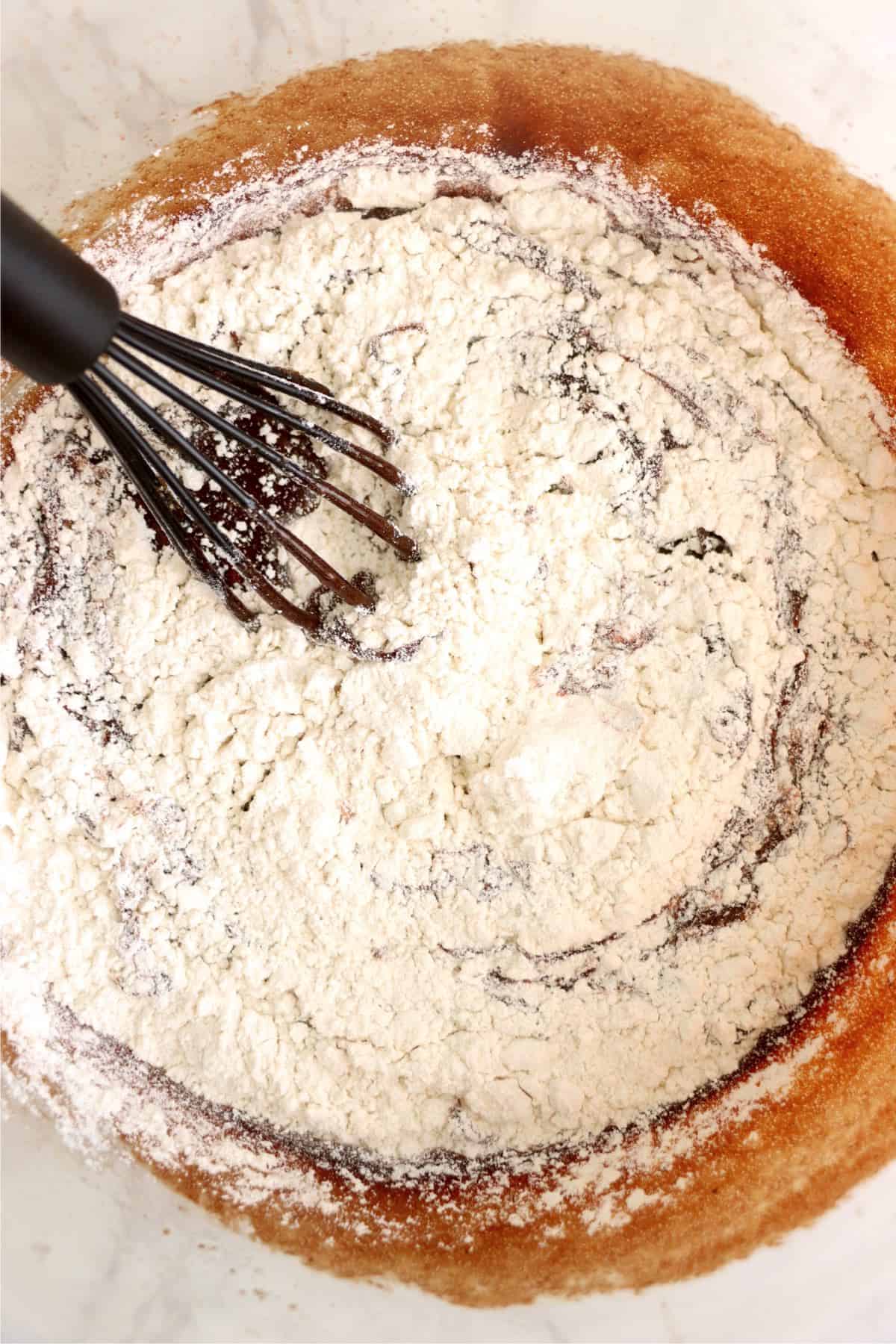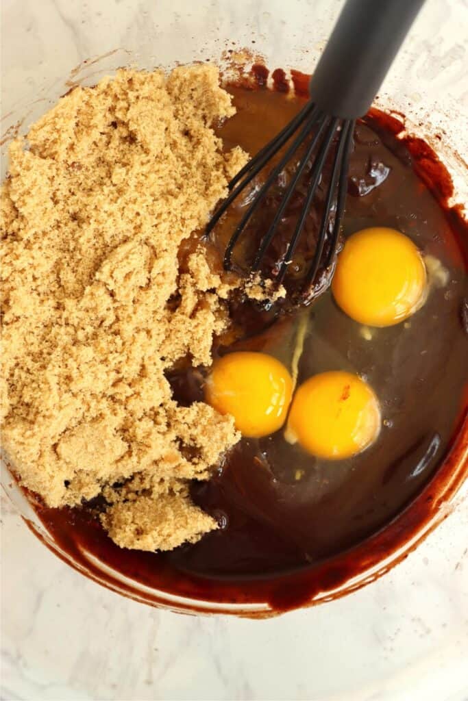- Add brown sugar and eggs. Whisk or beat with an electric mixer.