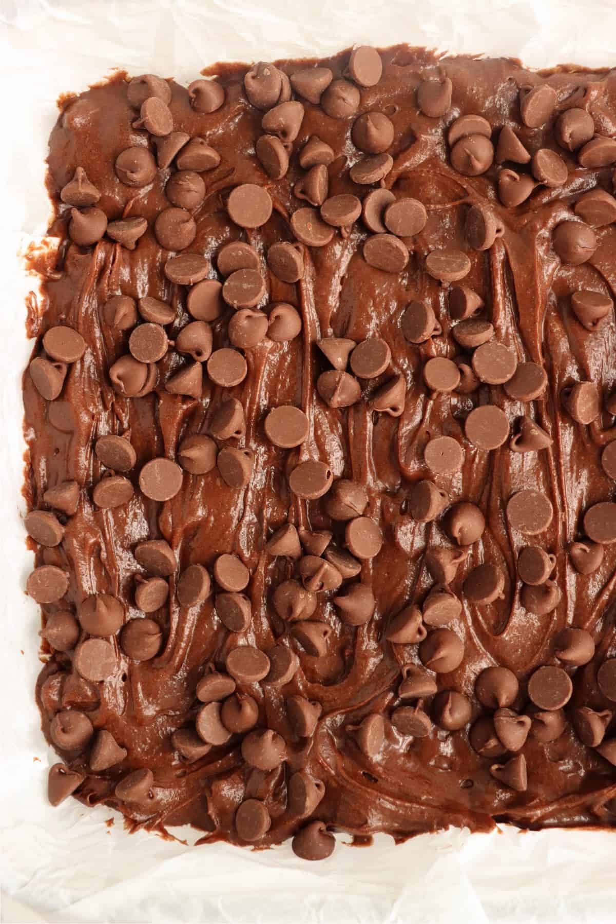 - Sprinkle remaining chocolate chips on top, pressing them into the batter gently.