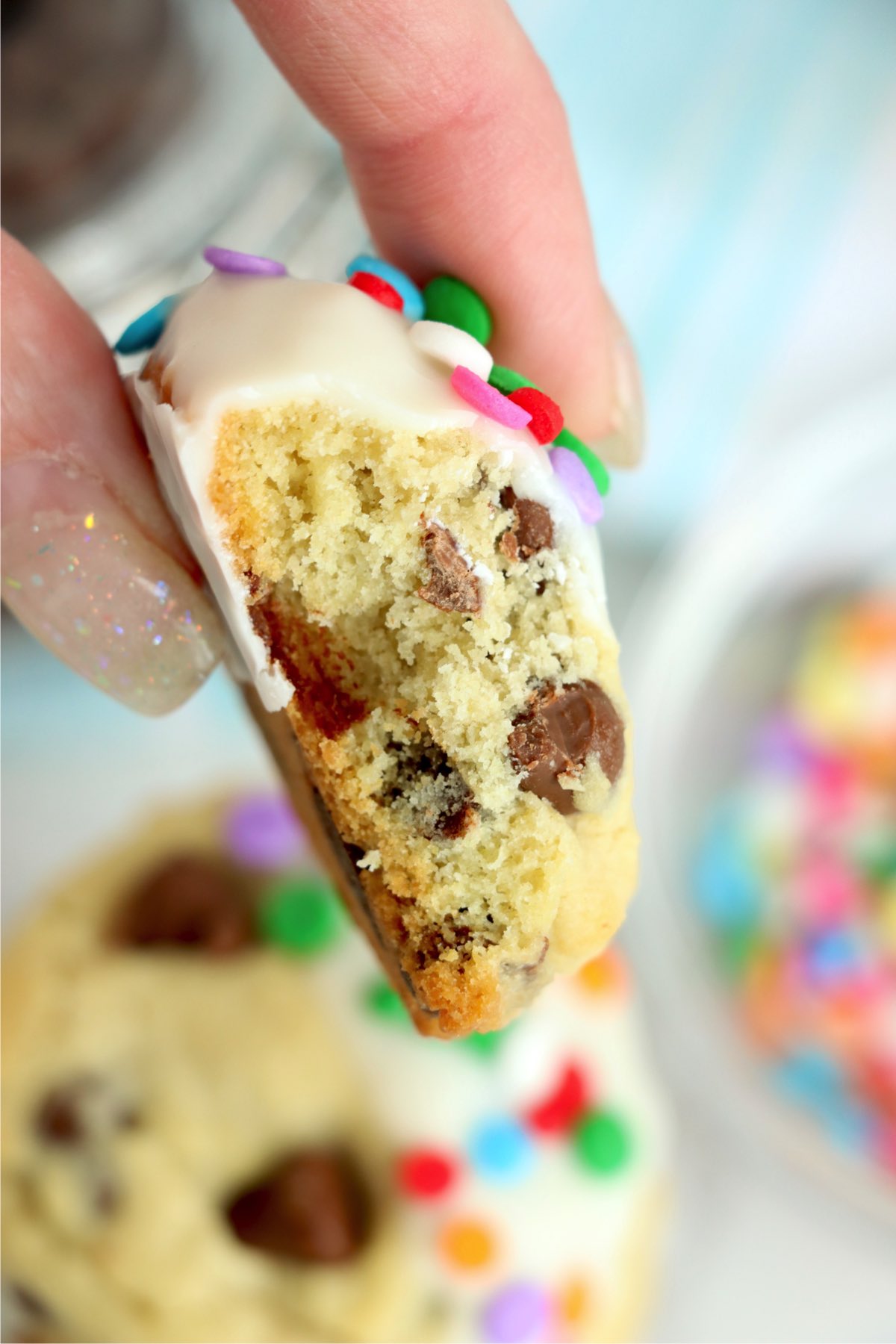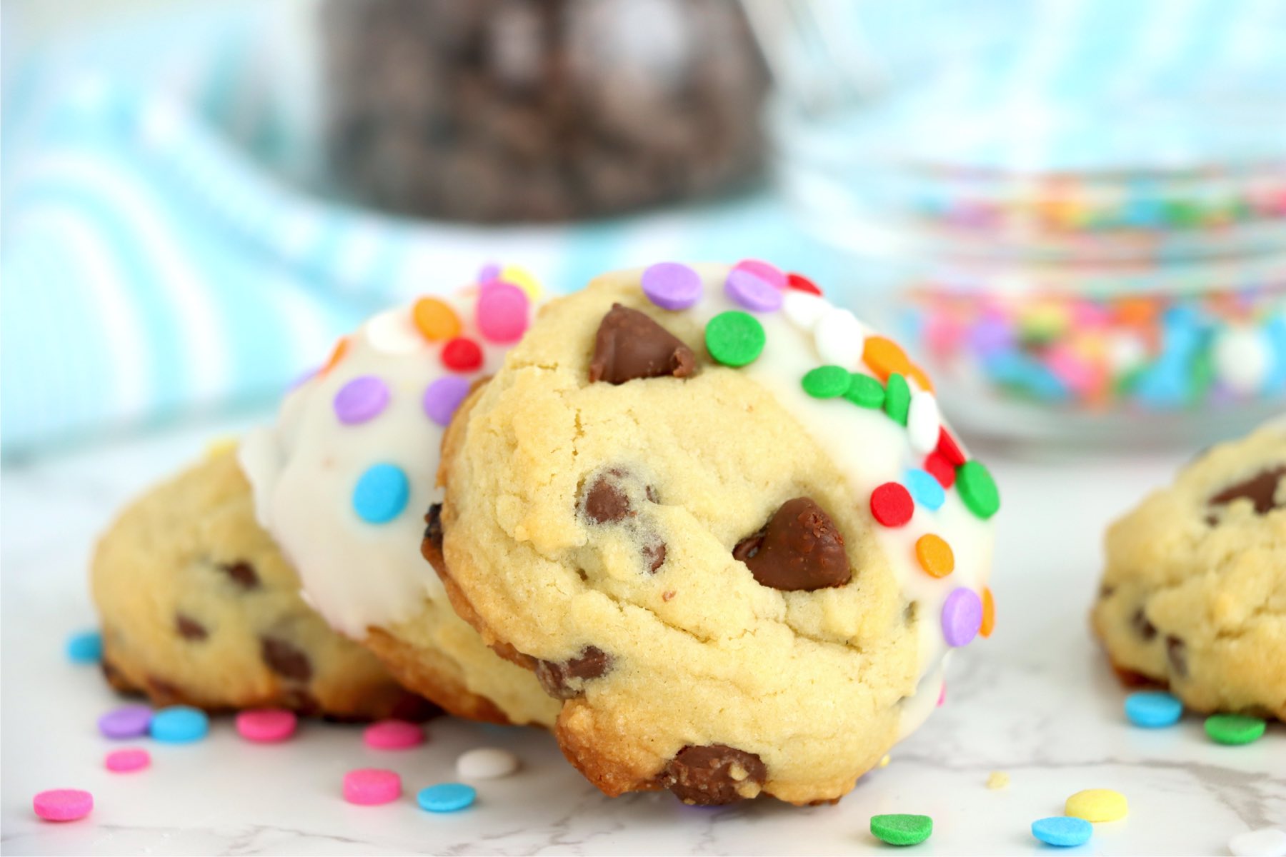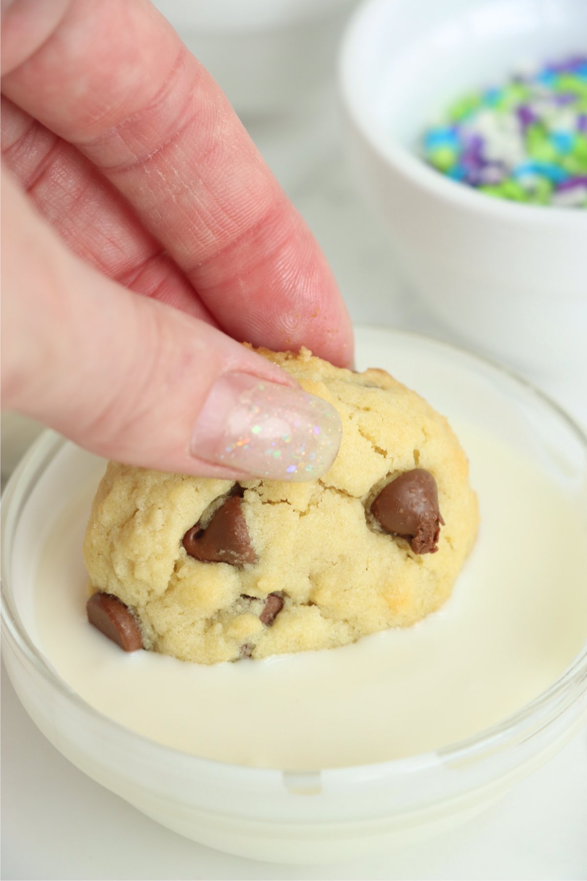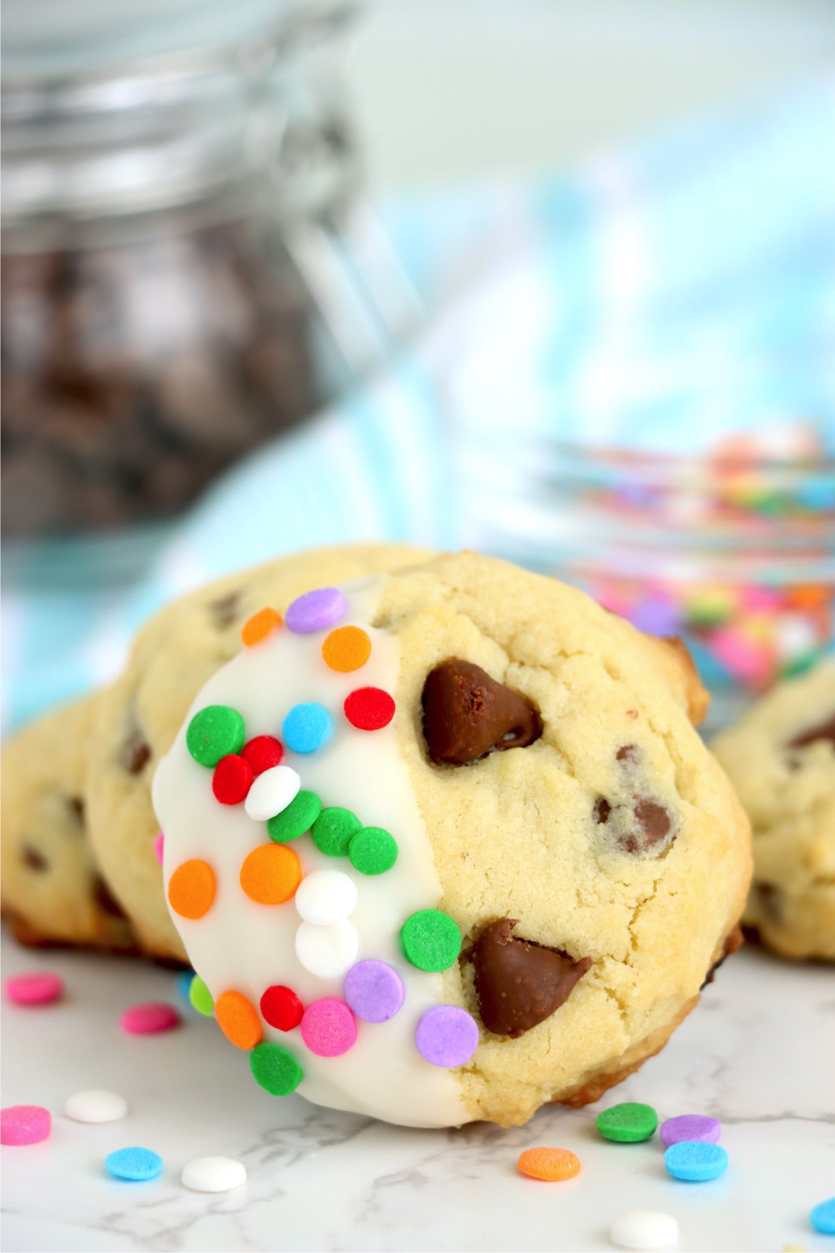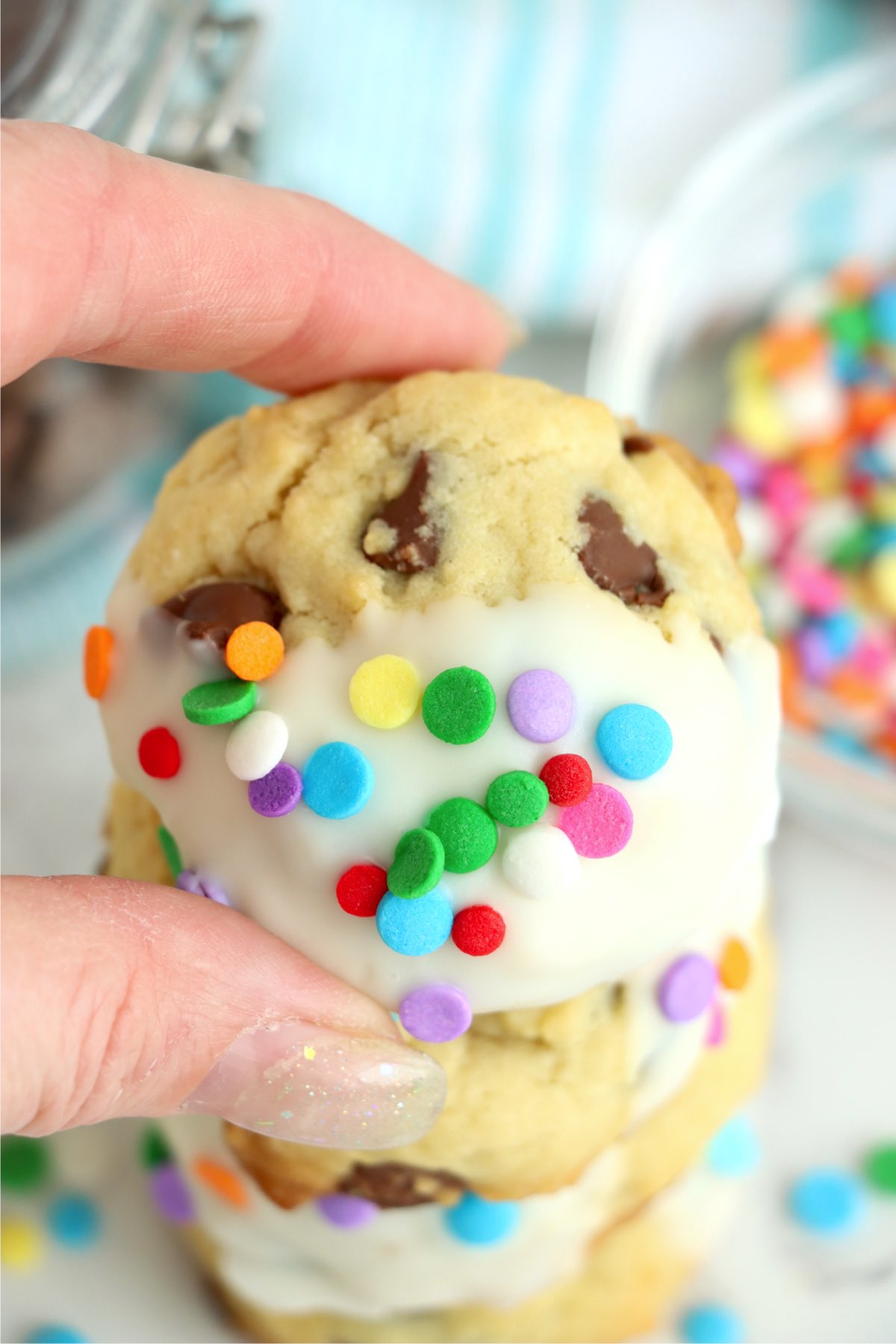 - Add sprinkles to the cookies immediately after dipping them so they stick to the melted chocolate.