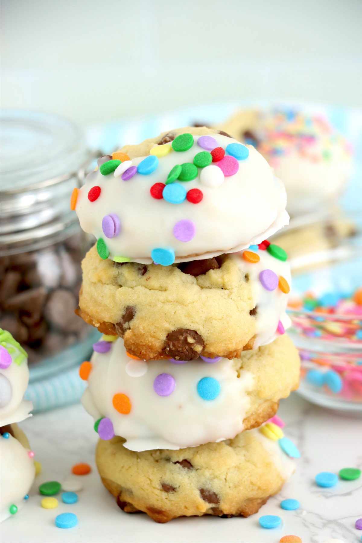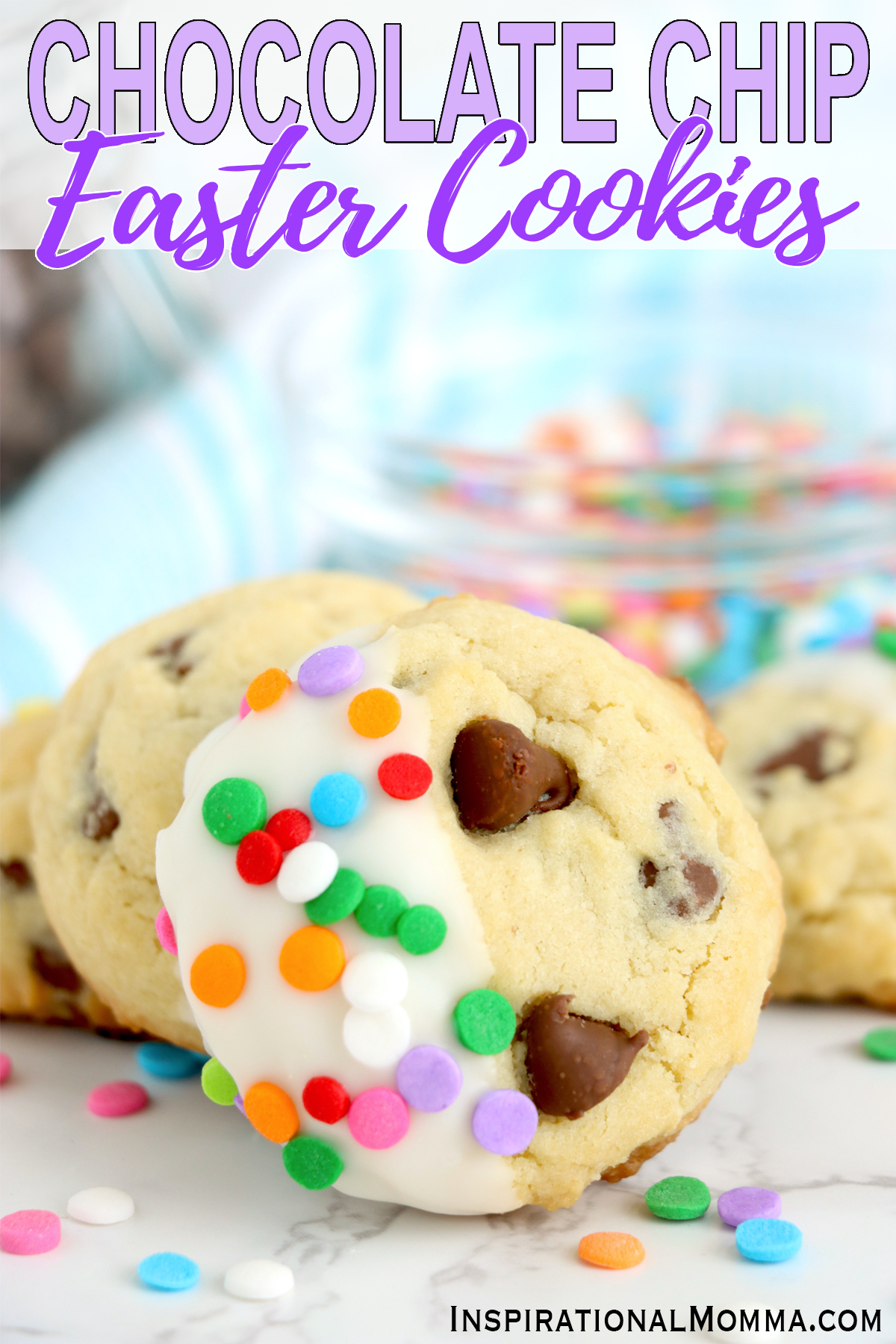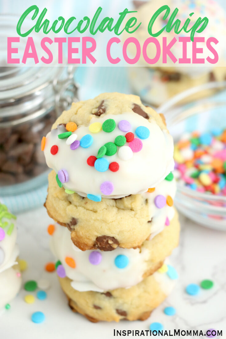 I love chocolate chip cookies, and I make them for any occasion that I possibly can. For Easter, I add a simple white glaze and fun sprinkles to make them a festive addition to the holiday spread.