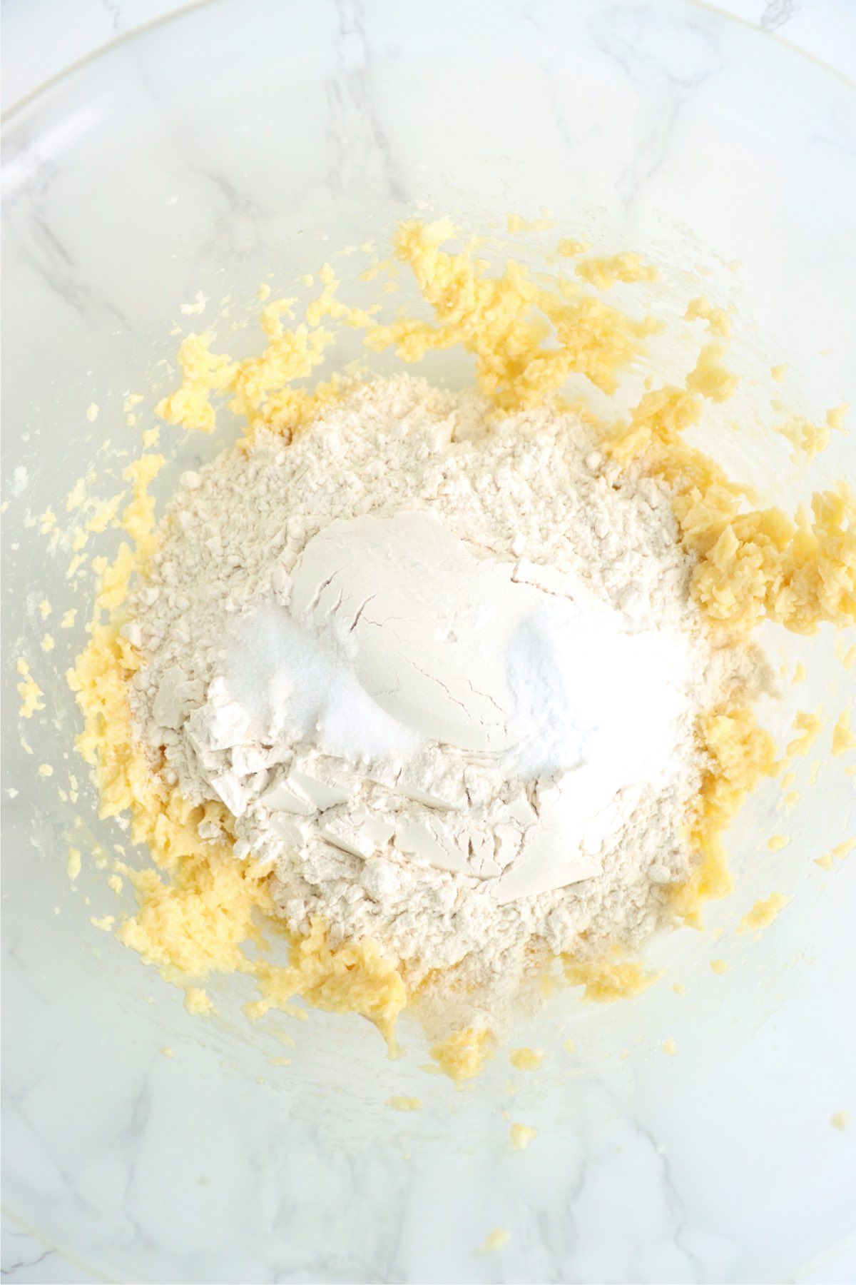 - Add flour, baking soda, and salt. Beat again until dough is uniform.