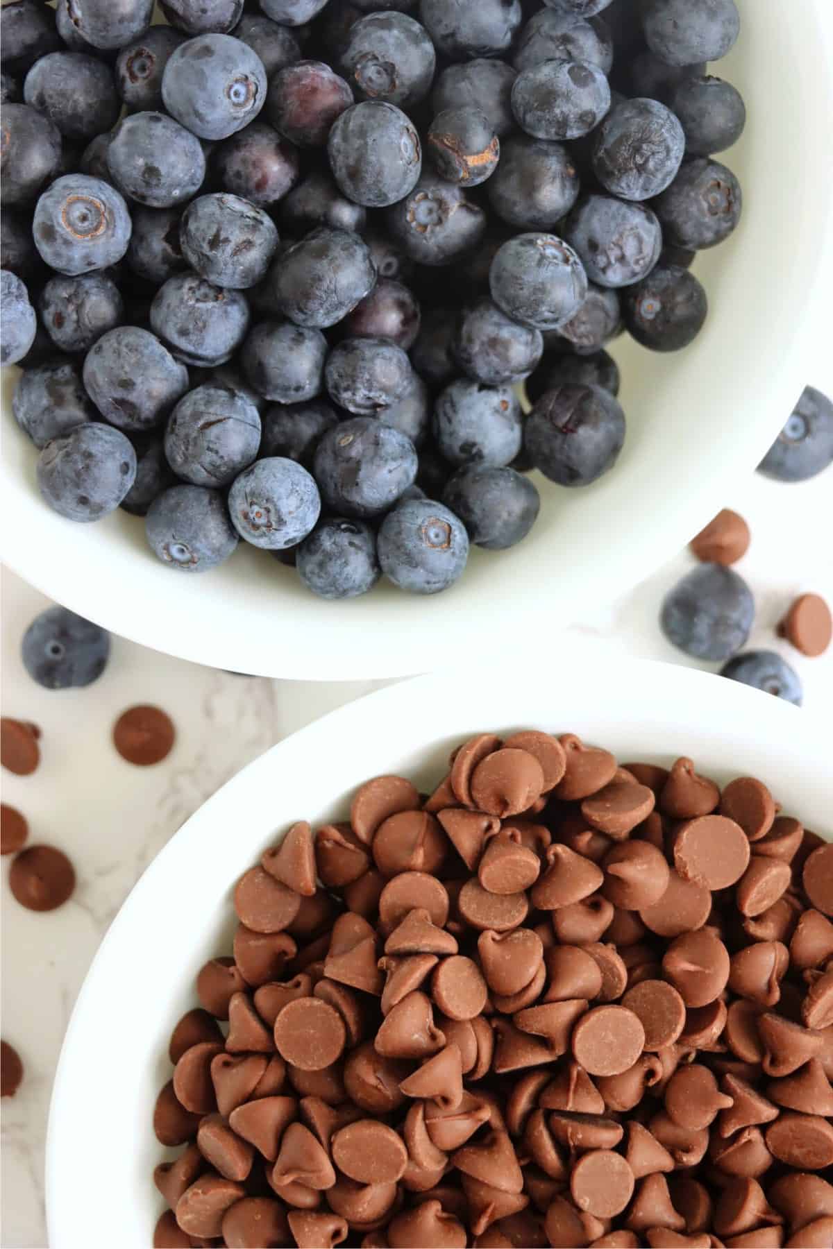 Use a spatula and gently fold the blueberries into the chocolate rather than mixing them. When spooning them out, be gentle and aim the tip of the spoon between berries.
