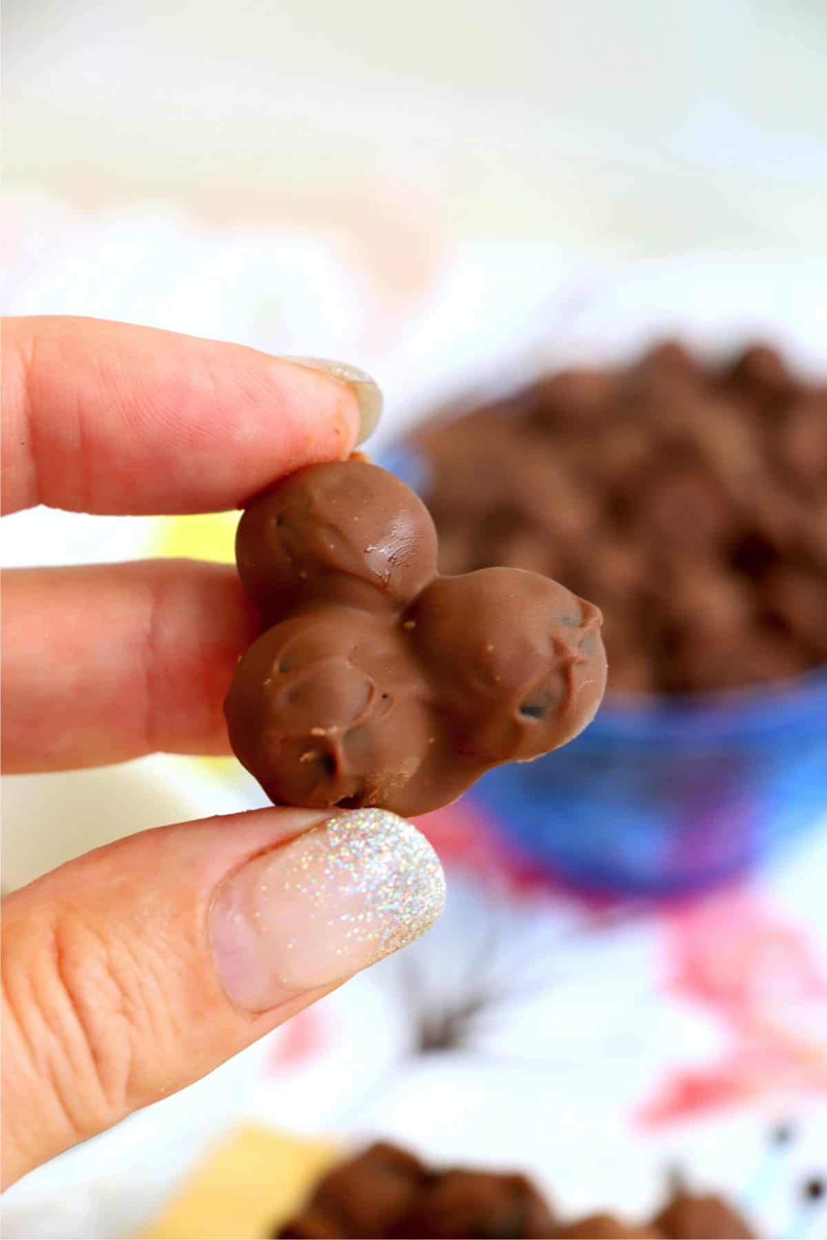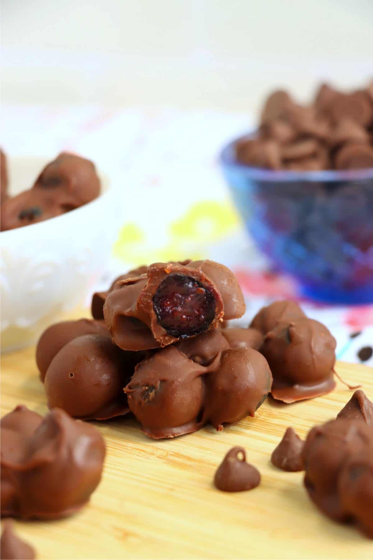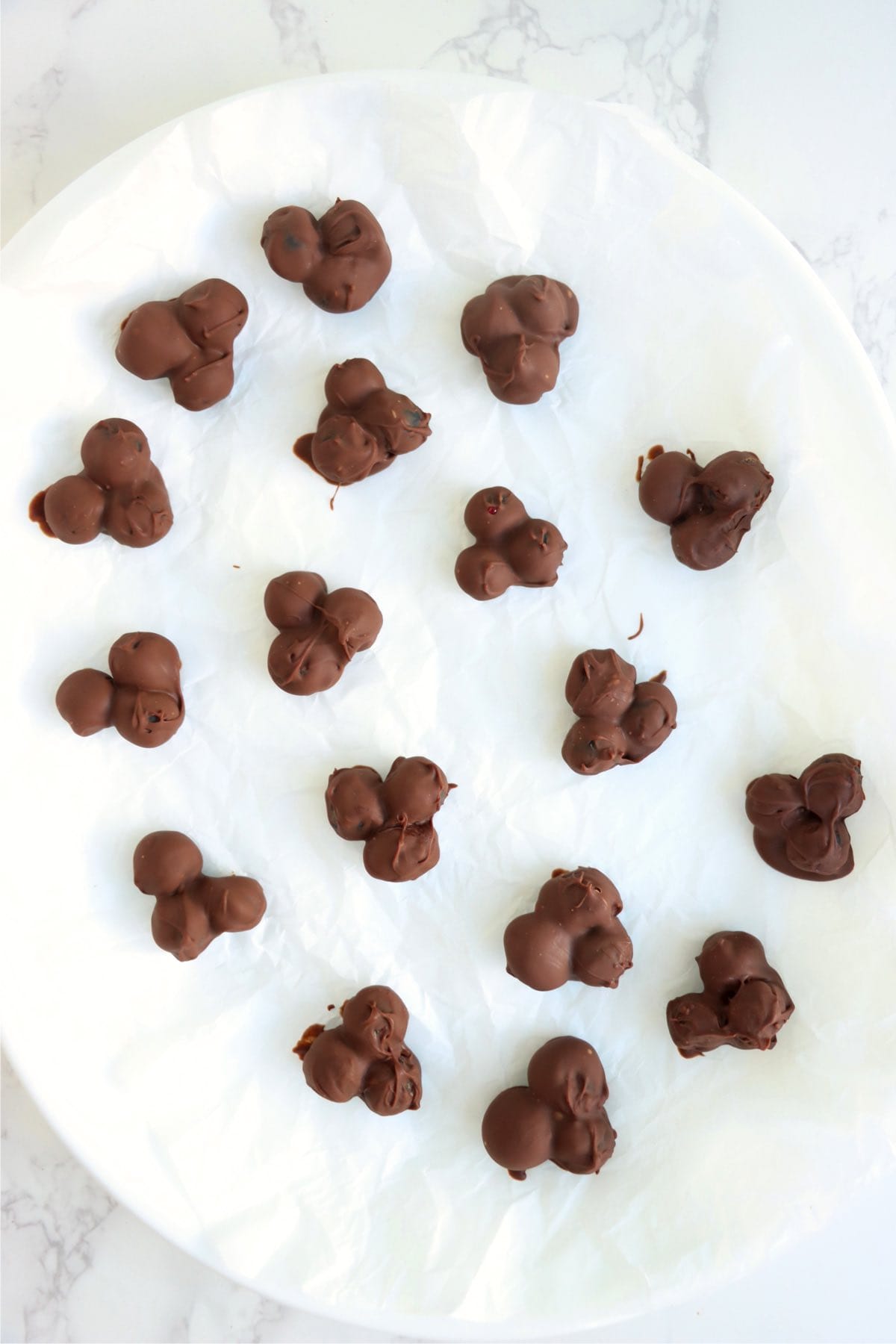 - Place small spoonfuls of chocolate covered blueberries on your prepared baking sheet. (If you want less chocolate in your clusters, be sure to allow excess chocolate to drip off in the bowl before placing them on the baking sheet.)