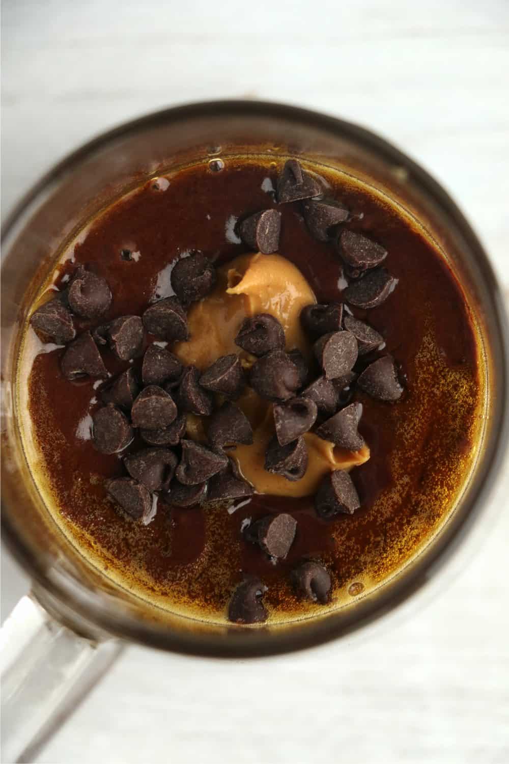 - Pour batter into a greased coffee mug that holds at least 10 oz. Drop peanut butter into the batter.