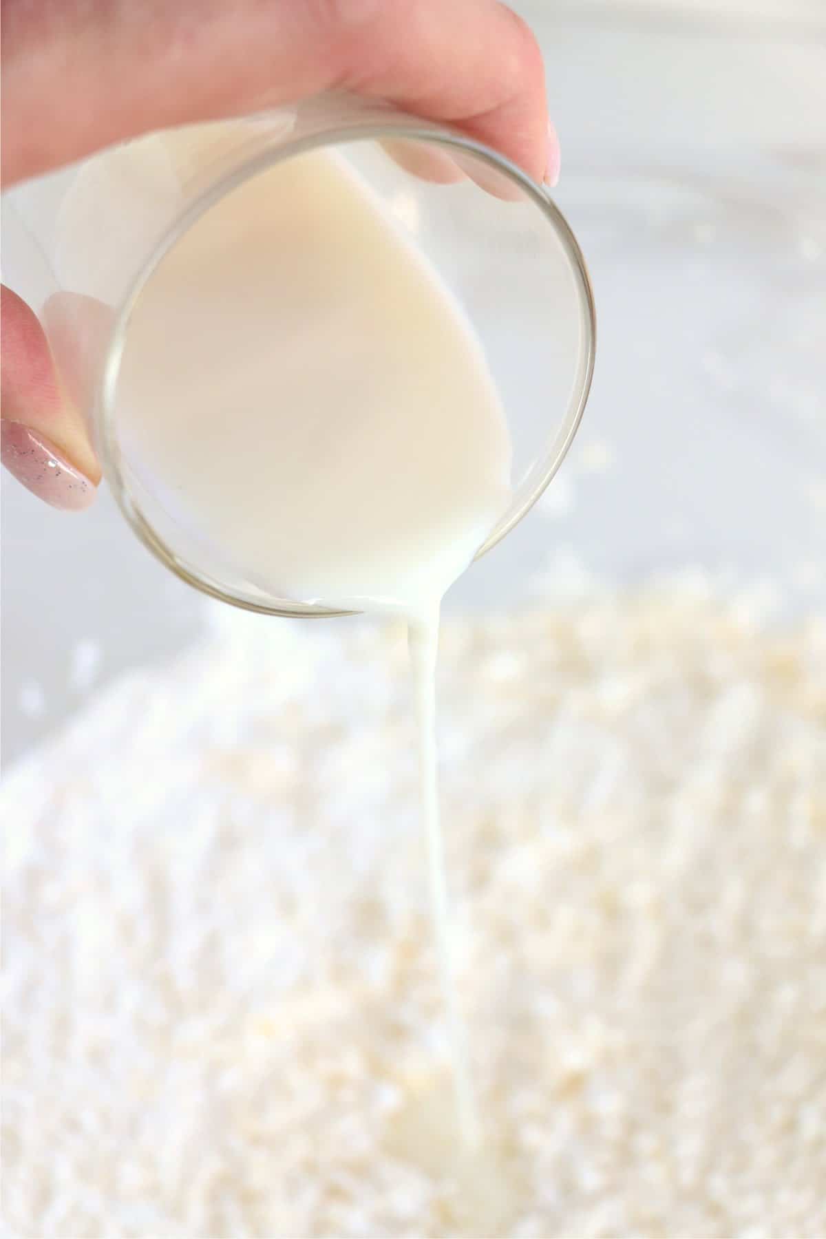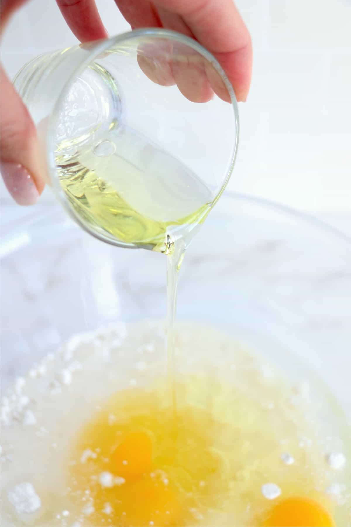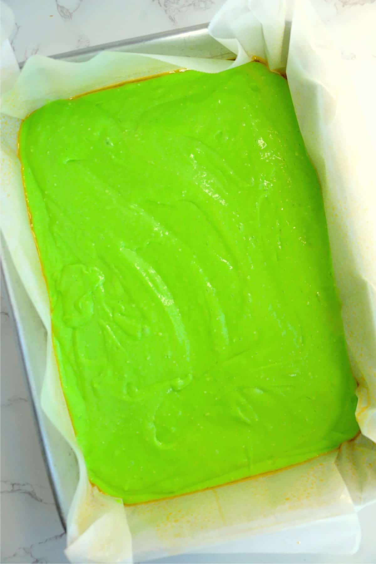 - Prepare a 9x13 cake pan by lining it with parchment paper and spraying it with cooking oil. Set aside.