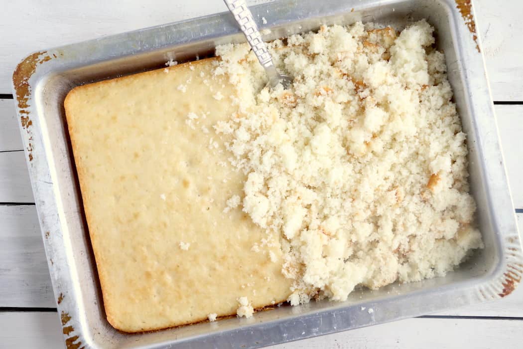 To get things started, prepare your cake according to the package directions. This will vary depending on the brand that you choose. Once your cake is done, allow it to cool. Using a fork, crumble the entire cake.