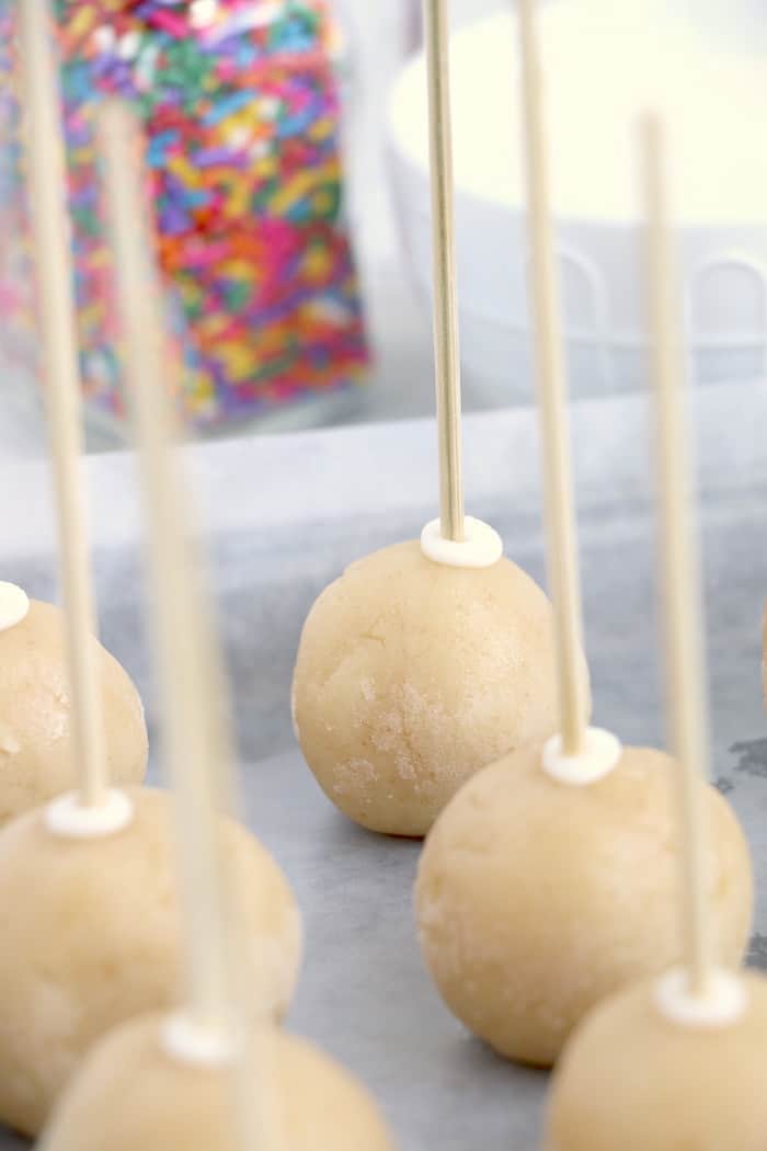- Melt a small amount of white chocolate chips. Dip skewers into melted chocolate and then push them into the cake pops.