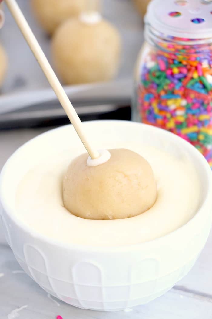 - Melt remaining white chocolate chips. Roll each cake pop in melted chocolate, allowing excess to drip off.