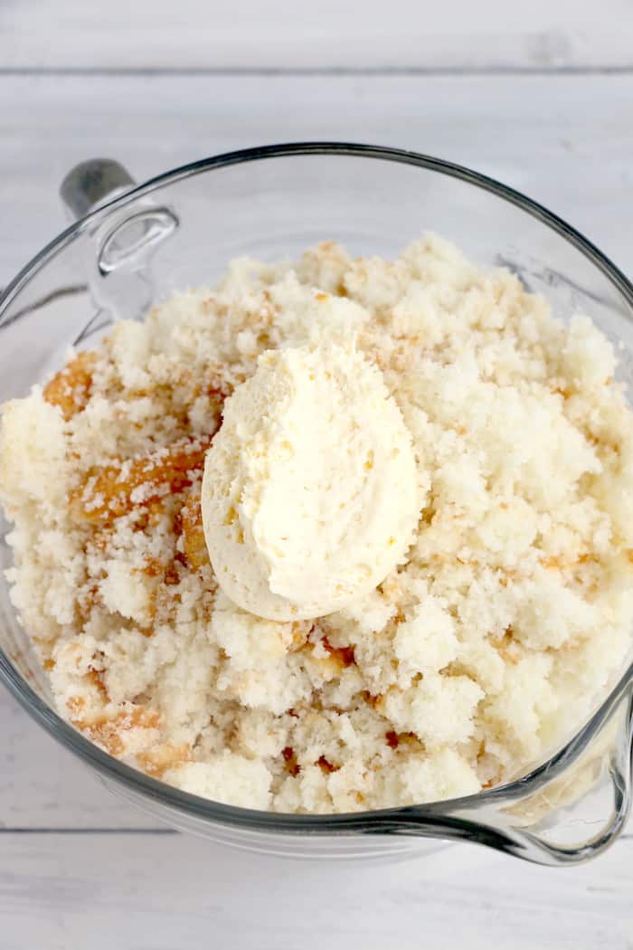- Add frosting to crumbled cake. Mix well (I use my hands) until dough is able to be formed into balls.