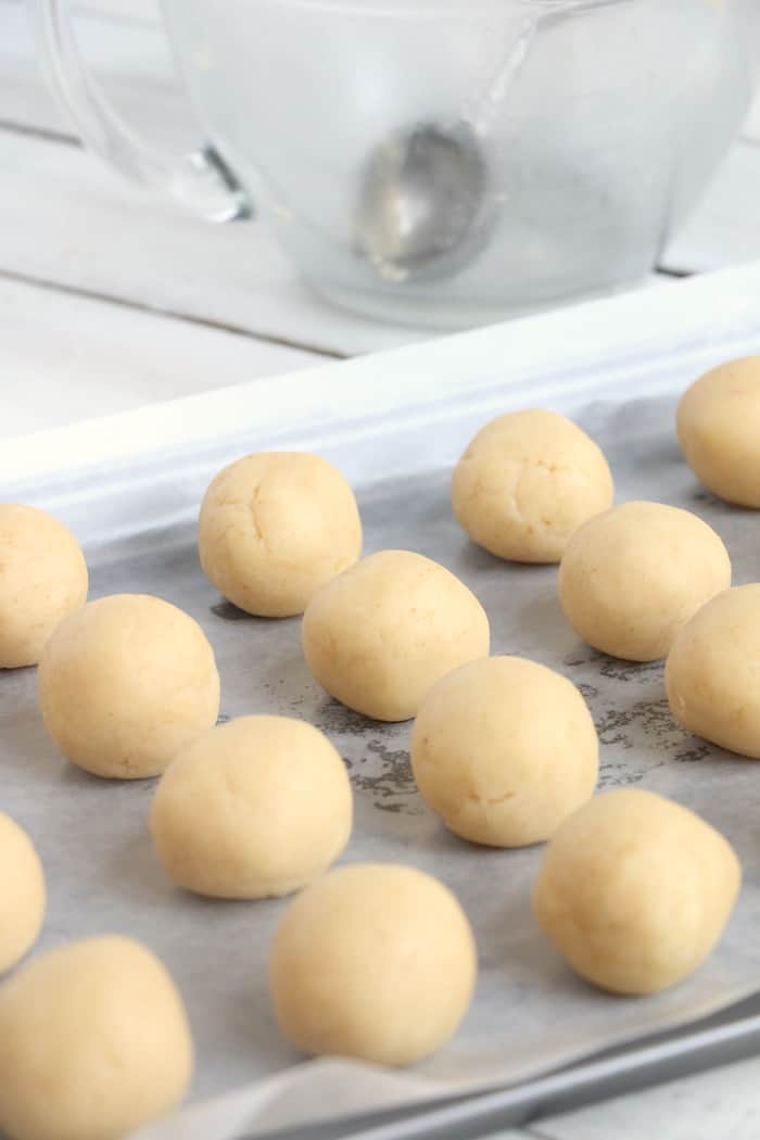 - Roll dough into 1-inch balls and place them on a baking sheet lined with wax paper.