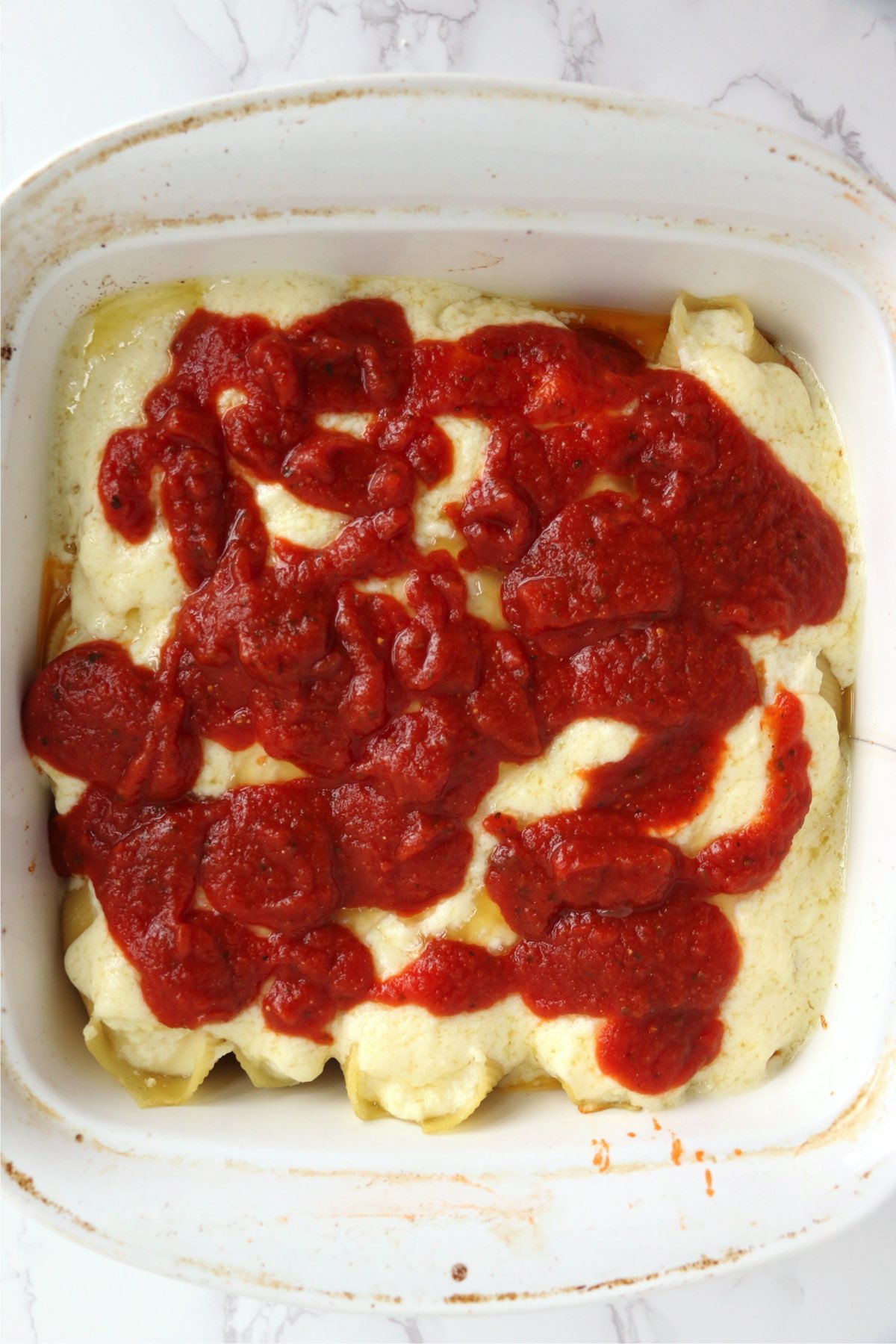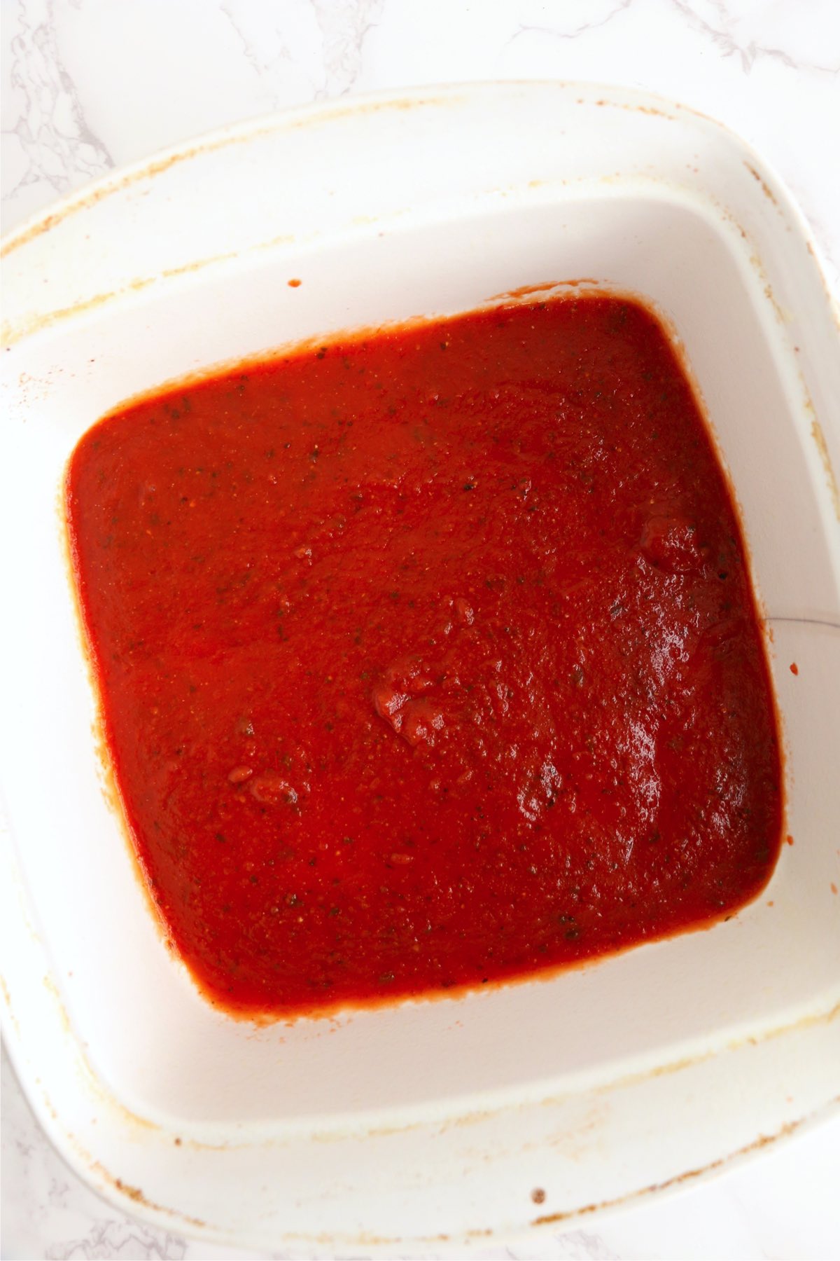 - Prepare an 8x8-inch baking dish by spraying it was nonstick cooking spray. Next, spread 1 cup of spaghetti sauce in the bottom Set aside.
