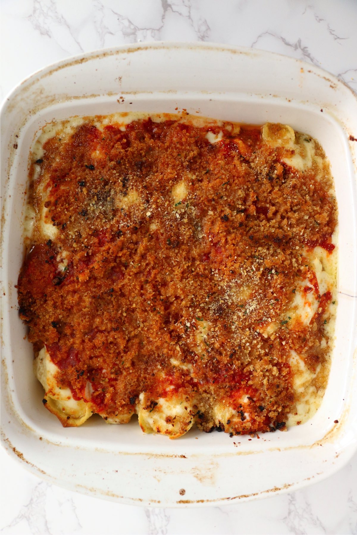 - In a small bowl, melt 1 tbsp butter and stir in breadcrumbs.