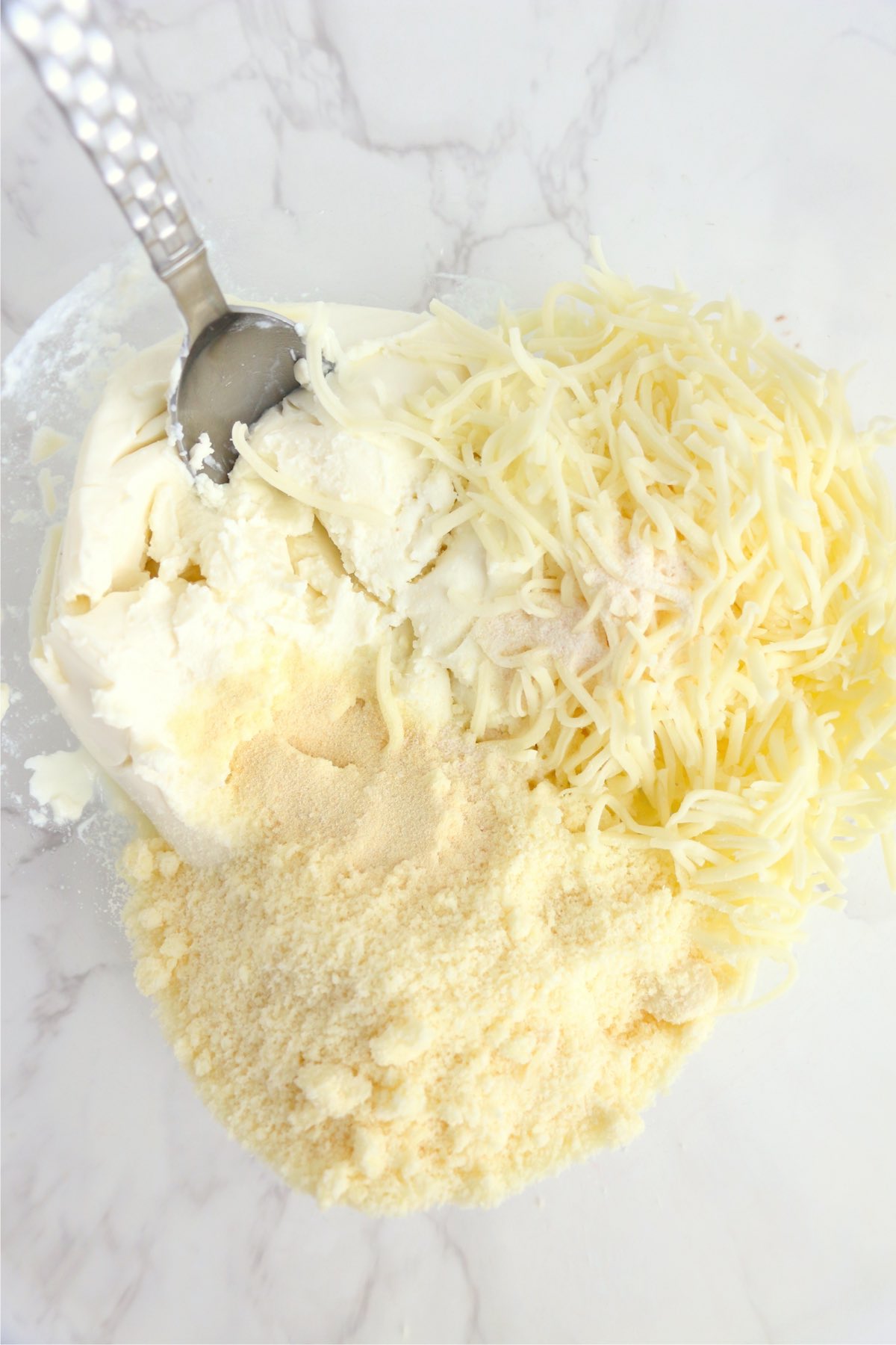 - In a large mixing bowl, combine ricotta cheese, 1 cup shredded mozzarella cheese, 1 cup grated parmesan cheese, 1 tsp garlic powder, and 1/2 tsp garlic salt.